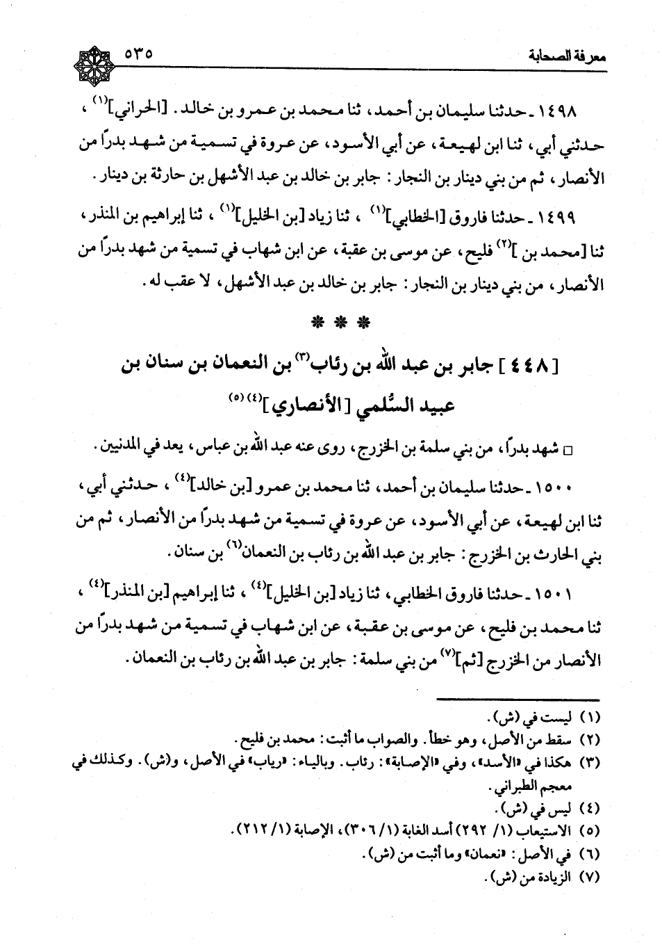 ١٥٠١ - حَدَّثَنَا فارُوقٌ الْخَطَّابِيُّ، ثنا زِيَادُ بْنُ الْخَلِيلِ، ثنا إِبْرَاهِيمُ بْنُ الْمُنْذِرِ، ثنا مُحَمَّدُ بْنُ فُلَيْحٍ، عَنْ مُوسَى بْنِ عُقْبَةَ، عَن ابْنِ شِهَابٍ، " فِي تَسْمِيَةِ مَنْ شَهِدَ بَدْرًا مِنَ الْأَنْصَارِ مِنَ الْخَزْرَجِ ثُمَّ مِنْ بَنِي سَلِمَةَ: جَابِرُ بْنُ عَبْدِ اللهِ بْنِ رِئَابِ بْنِ النُّعْمَانِ "
