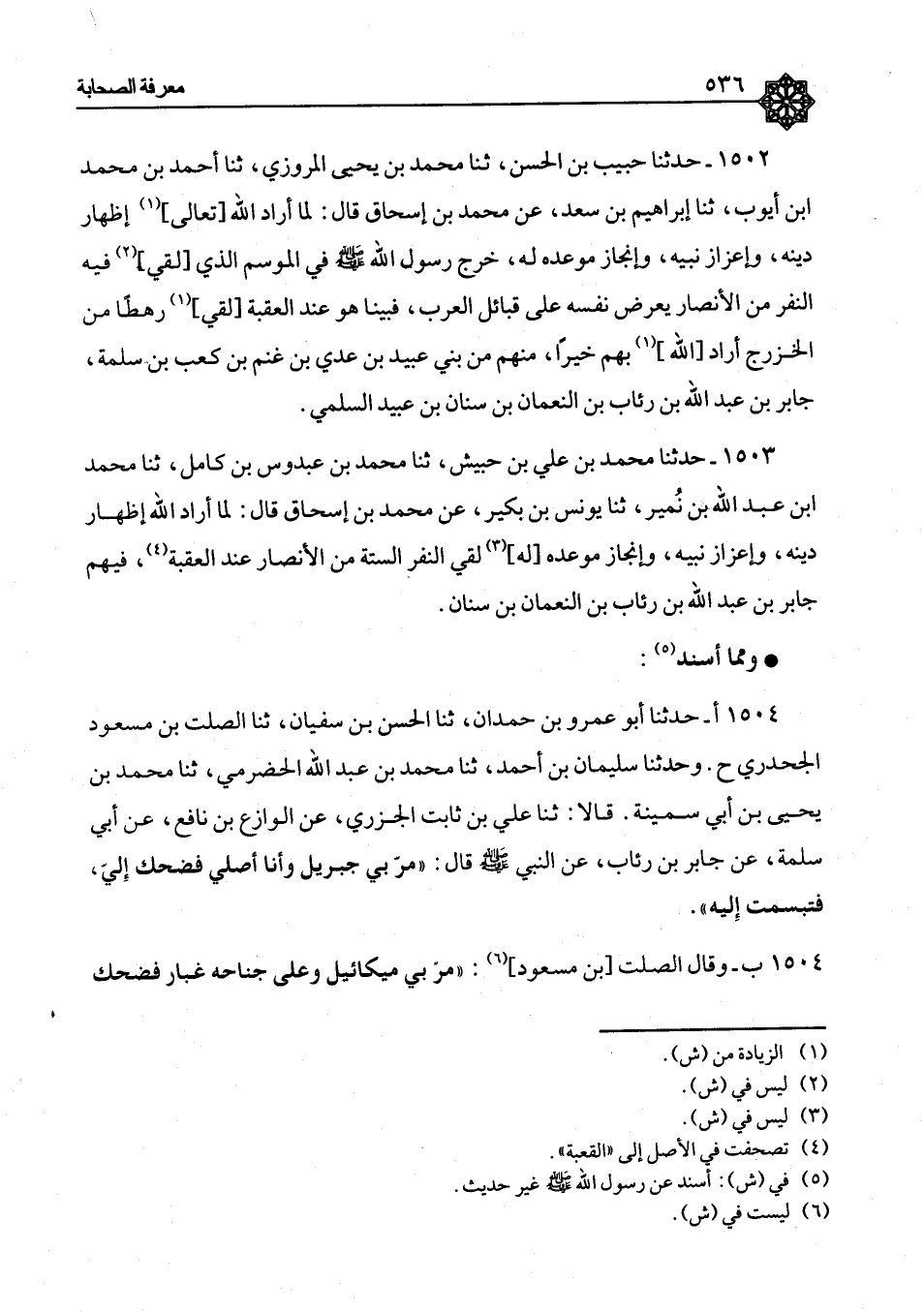 ١٥٠٣ - حَدَّثَنَا مُحَمَّدُ بْنُ عَلِيِّ بْنِ حُبَيْشٍ، ثنا مُحَمَّدُ بْنُ عَبْدُوسِ بْنِ كَامِلٍ، ثنا مُحَمَّدُ بْنُ عَبْدِ اللهِ بْنِ نُمَيْرٍ، ثنا يُونُسُ بْنُ بُكَيْرٍ، عَن مُحَمَّدِ بْنِ إِسْحَاقَ، قَالَ: لَمَّا أَرَادَ اللهُ إِظْهَارَ دِينِهِ، وَإِعْزَازَ نَبِيِّهِ، وَإِنْجَازَ مَوْعِدِهِ لَهُ لَقِيَ النَّفَرَ السِّتَّةَ مِنَ الْأَنْصَارِ عِنْدَ الْعَقَبَةِ، فِيهِمْ جَابِرُ بْنُ عَبْدِ اللهِ بْنِ رِئَابِ بْنِ النُّعْمَانِ بْنِ سِنَانٍ "