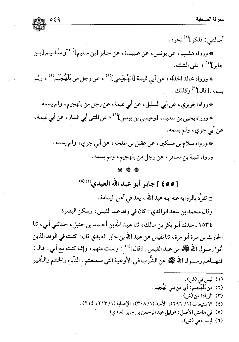١٥٣٤ - حَدَّثَنَا أَبُو بَكْرِ بْنُ مَالِكٍ، ثنا عَبْدُ اللهِ بْنُ أَحْمَدَ بْنِ حَنْبَلٍ، حَدَّثَنِي أَبِي، ثنا الْحَارِثُ بْنُ مُرَّةَ أَبُو مُرَّةَ، ثنا نَفِيسٌ، عَن عَبْدِ اللهِ بْنِ جَابِرٍ الْعَبْدِيِّ، قَالَ: " كُنْتُ فِي الْوَفْدِ الَّذِينَ أَتَوْا رَسُولَ اللهِ صَلَّى اللَّهُ عَلَيْهِ وَسَلَّمَ مِنْ عَبْدِ الْقَيْسِ قَالَ: وَلَسْتُ مِنْهُمْ، وَإِنَّمَا كُنْتُ مَعَ أَبِي، قَالَ: فَنَهَاهُمْ رَسُولُ اللهِ صَلَّى اللَّهُ عَلَيْهِ وَسَلَّمَ عَنِ الشُّرْبِ فِي الْأَوْعِيَةِ الَّتِي سَمِعْتُمْ: الدُّبَّاءِ وَالْحَنْتَمِ وَالنَّقِيرِ ⦗٥٥٠⦘ وَالْمُزَفَّتِ "