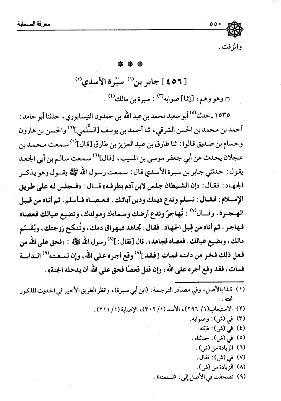 ١٥٣٥ - حَدَّثَنَا أَبُو سَعِيدٍ، مُحَمَّدُ بْنُ عَبْدِ اللهِ بْنِ حَمْدُونَ النَّيْسَابُورِيُّ، حَدَّثَنَا أَبُو حَامِدٍ، أَحْمَدُ بْنُ مُحَمَّدِ بْنِ الْحَسَنِ الشَّرْقِيُّ، ثنا أَحْمَدُ بْنُ يُوسُفَ السُّلَمِيُّ، وَالْحَسَنُ بْنُ هَارُونَ، وَحُسَامُ بْنُ صِدِّيقٍ، قَالُوا: ثنا طَارِقُ بْنُ عَبْدِ الْعَزِيزِ بْنِ طَارِقٍ، قَالَ: سَمِعْتُ مُحَمَّدَ بْنَ عَجْلَانَ، يُحَدِّثُ عَنْ أَبِي جَعْفَرٍ مُوسَى بْنِ الْمُسَيِّبِ، قَالَ: سَمِعْتُ سَالِمَ بْنَ أَبِي الْجَعْدِ، يَقُولُ: حَدَّثَنِي جَابِرُ بْنُ سَبْرَةَ الْأَسَدِيُّ، قَالَ: سَمِعْتُ رَسُولَ اللهِ صَلَّى اللَّهُ عَلَيْهِ وَسَلَّمَ يَقُولُ وَهُوَ يَذْكُرُ الْجِهَادَ فَقَالَ: «إِنَّ الشَّيْطَانَ جَلَسَ لِابْنِ آدَمَ بِطُرِقِهِ» قَالَ: " فَجَلَسَ لَهُ عَلَى طَرِيقِ الْإِسْلَامِ: فَقَالَ: تُسْلِمُ وَتَدَعُ دِينَكَ وَدِينَ آبَائِكَ؟ فَعَصَاهُ فَأَسْلَمَ، ثُمَّ أَتَاهُ مِنْ قِبَلِ الْهِجْرَةِ وَقَالَ: تُهَاجِرُ وَتَدَعُ أَرْضَكَ وَسَمَاءَكَ وَمَوْلِدَكَ، وَتُضَيِّعُ عِيَالَكَ؟ فَعَصَاهُ فَهَاجَرَ، ثُمَّ أَتَاهُ مِنْ قِبَلِ الْجِهَادِ فَقَالَ: تُجَاهِدُ فَيُهْرَاقُ دَمُكَ، وَتُنْكَحُ زَوْجَتُكَ، وَيُقْسَمُ مَالُكَ، وَيَضِيعُ عِيَالُكَ؟ فَعَصَاهُ فَجَاهَدَ "، قَالَ: فَقَالَ رَسُولُ اللهِ صَلَّى اللَّهُ عَلَيْهِ وَسَلَّمَ: «فَحَقٌّ عَلَى اللهِ مَنْ فَعَلَ ذَلِكَ فَخَرَّ مِنْ دَابَّتِهِ فَمَاتَ فَقَدْ وَقَعَ أَجْرُهُ عَلَى اللهِ، وَإِنْ لَسَعَتْهُ الدَّابَّةُ فَمَاتَ، فَقَدْ وَقَعَ أَجْرُهُ عَلَى اللهِ، وَإِنْ قُتِلَ قَعْصًا فَحَقٌّ عَلَى اللهِ أَنْ يُدْخِلَهُ الْجَنَّةَ» ⦗٥٥١⦘ قَالَ طَارِقٌ: الْقَعْصُ: قَتْلُ الصَّبْرِ، أَتْمَمْتُ بَعْضَ اللَّفْظِ مِنْ كِتَابِ غَيْرِي، وَهَذَا مِمَّا وَهِمَ فِيهِ طَارِقٌ وَتَفَرَّدَ بِذِكْرِ جَابِرٍ وَرَوَاهُ ابْنُ فُضَيْلٍ عَنْ مُوسَى بْنِ أَبِي جَعْفَرٍ، عَنْ سَالِمٍ، عَنْ سَبْرَةَ بْنِ أَبِي فَاكِهَةَ، وَالْمَشْهُورُ، حَدَّثَنَاهُ عَلِيُّ بْنُ عَبْدِ اللهِ بْنِ مُحَمَّدٍ قَالَ: حَدَّثَنَا عَبْدُ اللهِ بْنُ مُحَمَّدٍ، ثنا عَمِّي أَبُو زُرْعَةَ، حَدَّثَنِي عَبْدُ الرَّحْمَنِ بْنُ عَبْدِ الْمَلِكِ الْحَرَّانِيُّ، ثنا طَارِقٌ مِثْلَهُ، وَقَالَ جَابِرُ بْنُ أَبِي سَبْرَةَ بِلَفْظِهِ مِثْلَهُ