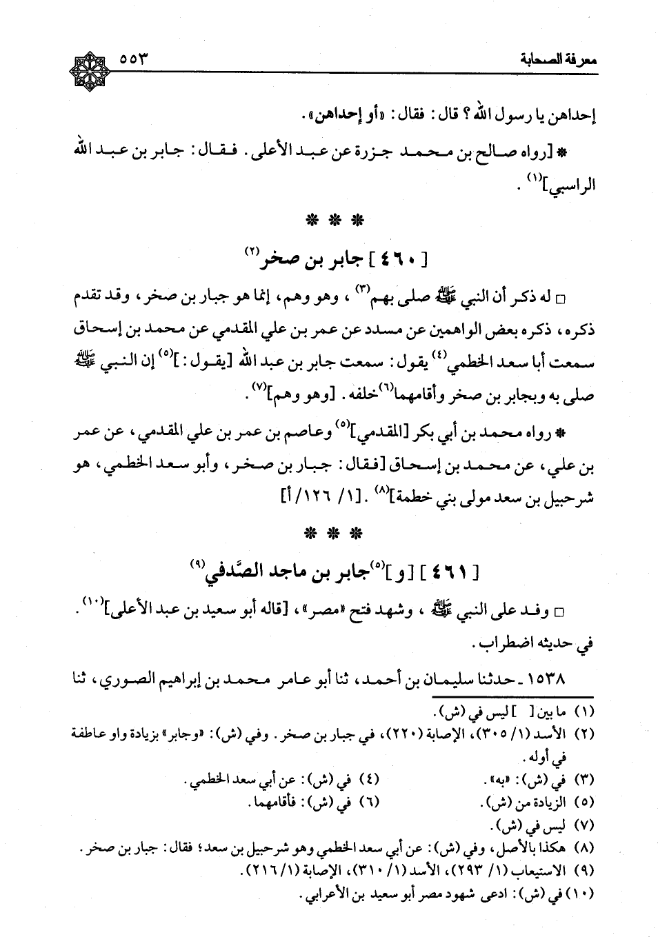 ذَكَرَهُ بَعْضُ الْوَاهِمِينَ عَنْ مُسَدَّدٍ، عَنْ عُمَرَ بْنِ عَلِيٍّ الْمُقَدَّمِيِّ، عَنْ مُحَمَّدِ بْنِ إِسْحَاقَ، سَمِعْتُ أَبَا سَعْدٍ الْخَطْمِيَّ يَقُولُ: سَمِعْتُ جَابِرَ بْنَ عَبْدِ اللهِ يَقُولُ: " إِنَّ النَّبِيَّ صَلَّى اللَّهُ عَلَيْهِ وَسَلَّمَ صَلَّى بِهِ وَبِجَابِرِ بْنِ صَخْرٍ وَأَقَامَهُمَا خَلْفَهُ، وَهُوَ وَهْمٌ رَوَاهُ مُحَمَّدُ بْنُ أَبِي بَكْرٍ الْمُقَدَّمِيُّ، وَعَاصِمُ بْنُ عُمَرَ بْنِ عَلِيٍّ الْمُقَدَّمِيُّ، عَنْ عُمَرَ بْنِ عَلِيٍّ، عَنْ مُحَمَّدِ بْنِ إِسْحَاقَ فَقَالَ: جَبَّارُ بْنُ صَخْرٍ، وَأَبُو سَعْدٍ الْخَطْمِي، هُوَ شُرَحْبِيلُ بْنُ سَعْدٍ مَوْلَى بَنِي خَطْمَةَ