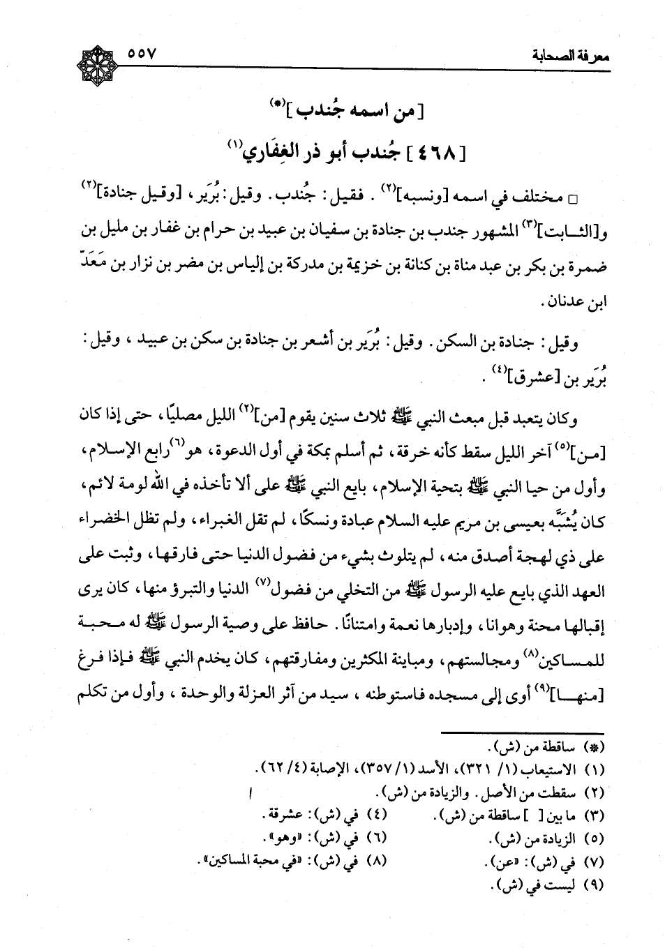 جُنْدُبٌ أَبُو ذَرٍّ الْغِفَارِيُّ مُخْتَلَفٌ فِي اسْمِهِ وَنَسَبِهِ. فَقِيلَ: جُنْدُبٌ، وَقِيلَ: بُرَيْرٌ، وَقِيلَ: جُنَادَةُ، وَالثَّابِتُ الْمَشْهُورُ جُنْدُبُ بْنُ جُنَادَةَ بْنِ سُفْيَانَ بْنِ عُبَيْدِ بْنِ حَرَامِ بْنِ غِفَارِ بْنِ مُلَيْلِ بْنِ ضَمْرَةَ بْنِ بَكْرِ بْنِ عَبْدِ مَنَاةَ بْنِ كِنَانَةَ بْنِ خُزَيْمَةَ بْنِ مُدْرِكَةَ بْنِ إِلْيَاسِ بْنِ مُضَرَ بْنِ نِزَارِ بْنِ مَعْدِ بْنِ عَدْنَانَ وَقِيلَ: جُنَادَةُ بْنُ السَّكَنِ، وَقِيلَ: بُرَيْرُ بْنُ أَشْعَرَ بْنِ جُنَادَةَ بْنِ سَكَنِ بْنِ عُبَيْدٍ، وَقِيلَ: بُرَيْرُ بْنُ عَشْرَقٍ. وَكَانَ يَتَعَبَّدُ قَبْلَ مَبْعَثِ النَّبِيِّ صَلَّى اللَّهُ عَلَيْهِ وَسَلَّمَ ثَلَاثَ سِنِينَ يَقُومُ مِنَ اللَّيْلِ مُصَلِّيًا، حَتَّى إِذْ كَانَ مِنْ آخِرِ اللَّيْلِ سَقَطَ كَأَنَّهُ خِرْقَةٌ، ثُمَّ أَسْلَمَ بِمَكَّةَ فِي أَوَّلِ الدَّعْوَةِ، هُوَ رَابِعُ الْإِسْلَامِ، وَأَوَّلُ مَنْ حَيَّا النَّبِيَّ صَلَّى اللَّهُ عَلَيْهِ وَسَلَّمَ بِتَحِيَّةِ الْإِسْلَامِ، بَايَعَ النَّبِيَّ صَلَّى اللَّهُ عَلَيْهِ وَسَلَّمَ عَلَى أَلَا تَأْخُذَهُ فِي اللهِ لَوْمَةُ لَائِمٍ، كَانَ يُشَبَّهُ بِعِيسَى ابْنِ مَرْيَمَ عَلَيْهِ السَّلَامُ عِبَادَةً وَنُسُكًا، لَمْ تُقِلَّ الْغَبْرَاءُ، وَلَمْ تُظِلَّ الْخَضْرَاءُ عَلَى ذِي لَهْجَةٍ أَصْدَقَ مِنْهُ، لَمْ يَتَلَوَّثْ بِشَيْءٍ مِنْ فُضُولِ الدُّنْيَا حَتَّى فَارَقَهَا، وَثَبَتَ عَلَى الْعَهْدِ الَّذِي بَايَعَ عَلَيْهِ الرَّسُولَ صَلَّى اللَّهُ عَلَيْهِ وَسَلَّمَ مِنَ التَّخَلِّي مِنْ فُضُولِ الدُّنْيَا وَالتَّبَرُّؤِ مِنْهَا، كَانَ يَرَى إِقْبَالَهَا مِحْنَةً وَهَوَانًا، وَإِدْبَارَهَا نِعْمَةً وَامْتِنَانًا، حَافَظَ عَلَى وَصِيَّةِ الرَّسُولِ صَلَّى اللَّهُ عَلَيْهِ وَسَلَّمَ لَهُ: مَحَبَّةٌ لِلْمَسَاكِينِ وَمُجَالَسَتِهِمْ، وَمُبَايَنَةُ الْمُكْثِرِينَ وَمُفَارَقَتِهِمْ، كَانَ يَخْدُمُ النَّبِيَّ صَلَّى اللَّهُ عَلَيْهِ وَسَلَّمَ فَإِذَا فَرَغَ مِنْهَا أَوَى إِلَى مَسْجِدِهِ فَاسْتَوْطَنَهُ، سَيِّدُ مِنْ آثَرَ الْعُزْلَةَ وَالْوَحْدَةَ، وَأَوَّلُ مِنْ تَكَلَّمَ