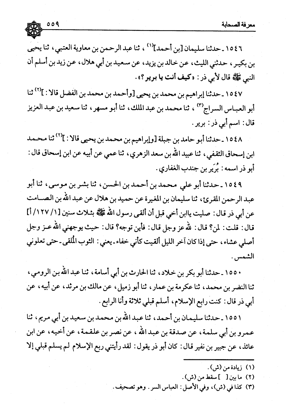١٥٤٨ - حَدَّثَنَا أَبُو حَامِدِ بْنُ جَبَلَةَ، وَإِبْرَاهِيمُ بْنُ مُحَمَّدِ بْنِ يَحْيَى، قَالَا: ثنا مُحَمَّدُ بْنُ إِسْحَاقَ الثَّقَفِيُّ، ثنا عُبَيْدُ اللهِ بْنُ سَعْدٍ الزُّهْرِيُّ، ثنا عَمِّي، عَنْ أَبِيهِ، عَن ابْنِ إِسْحَاقَ، قَالَ: «أَبُو ذَرٍّ اسْمُهُ بُرَيْرُ بْنُ جُنْدُبٍ الْغِفَارِيُّ»