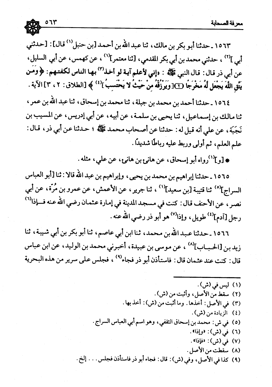 ١٥٦٥ - حَدَّثَنَا إِبْرَاهِيمُ بْنُ مُحَمَّدِ بْنِ يَحْيَى، وَإِبْرَاهِيمُ بْنُ عَبْدِ اللهِ، قَالَا: ثنا أَبُو الْعَبَّاسِ السَّرَّاجُ، ثنا قُتَيْبَةُ بْنُ سَعِيدٍ، ثنا جَرِيرٌ، عَنِ الْأَعْمَشِ، عَنْ عَمْرِو بْنِ مُرَّةَ، عَنْ أَبِي نَصْرٍ، عَن الْأَحْنَفِ، قَالَ: «كُنْتُ فِي مَسْجِدِ الْمَدِينَةِ فِي إِمَارَةِ عُثْمَانَ رَضِيَ اللهُ عَنْهُ فَإِذَا رَجُلٌ آدَمُ طَوِيلٌ، وَإِذَا هُوَ أَبُو ذَرٍّ رَضِيَ اللهُ عَنْهُ»