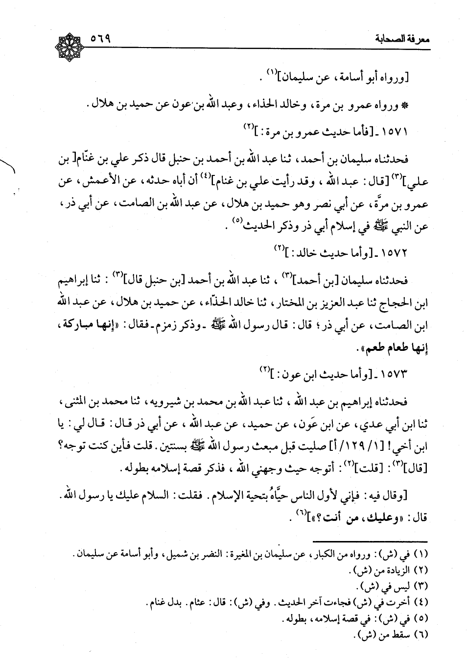 ١٥٧٣ - وَأَمَّا حَدِيثُ ابْنِ عَوْنٍ: فَحَدَّثَنَاهُ إِبْرَاهِيمُ بْنُ عَبْدِ اللهِ، ثنا عَبْدُ اللهِ بْنُ مُحَمَّدِ بْنِ شِيرَوَيْهِ، ثنا مُحَمَّدُ بْنُ الْمُثَنَّى، ثنا ابْنُ أَبِي عَدِيٍّ، عَنِ ابْنِ عَوْنٍ، عَنْ حُمَيْدٍ، عَنْ عَبْدِ اللهِ، عَن أَبِي ذَرٍّ، قَالَ: قَالَ لِي: يَا ابْنَ أَخِي " صَلَّيْتُ قَبْلَ مَبْعَثِ رَسُولِ اللهِ صَلَّى اللَّهُ عَلَيْهِ وَسَلَّمَ بِسَنَتَيْنِ، قُلْتُ: فَأَيْنَ كُنْتَ تُوَجِّهُ؟ قَالَ: قُلْتُ: أَتَوَجَّهُ حَيْثُ وَجَّهَنِي اللهُ، فَذَكَرَ قِصَّةَ إِسْلَامِهِ بِطُولِهِ، وَقَالَ فِيهِ: فَإِنِّي لَأَوَّلُ النَّاسِ حَيَّاهُ بِتَحِيَّةِ الْإِسْلَامِ، فَقُلْتُ: السَّلَامُ عَلَيْكَ يَا رَسُولَ اللهِ، قَالَ: «وَعَلَيْكَ، مَنْ أَنْتَ؟» ⦗٥٧٠⦘ وَرَوَاهُ أَبُو هِلَالٍ الرَّاسِبِيُّ، عَنْ حُمَيْدِ بْنِ هِلَالٍ
