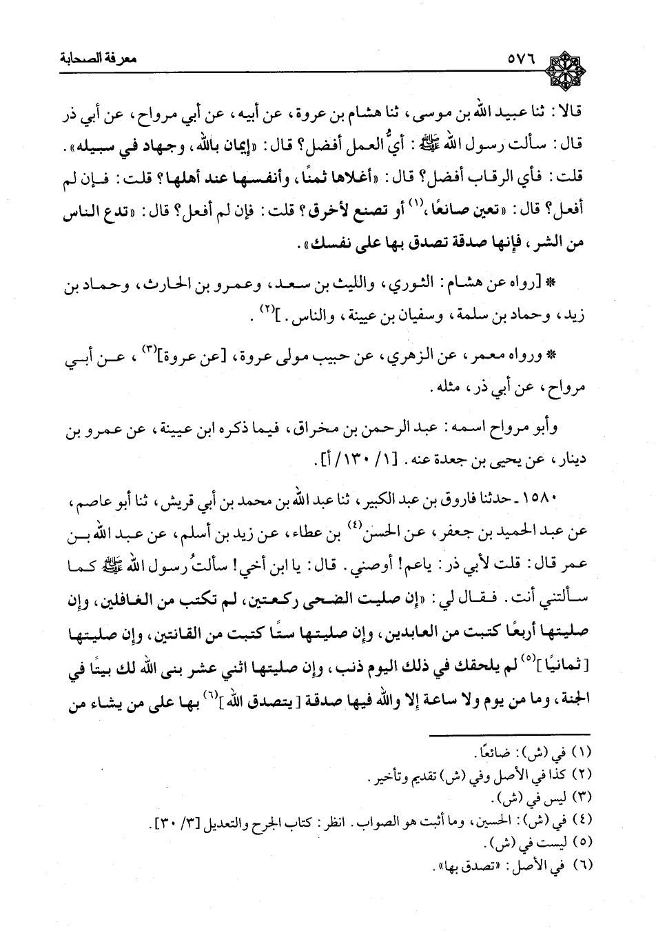١٥٨٠ - حَدَّثَنَا فَارُوقُ بْنُ عَبْدِ الْكَبِيرِ، ثنا عَبْدُ اللهِ بْنُ مُحَمَّدِ بْنِ أَبِي قُرَيْشٍ ثنا أَبُو عَاصِمٍ، عَنْ عَبْدِ الْحَمِيدِ بْنِ جَعْفَرٍ، عَنِ الْحَسَنِ بْنِ عَطَاءٍ، عَنْ زَيْدِ بْنِ أَسْلَمَ، عَن عَبْدِ اللهِ بْنِ عُمَرَ، قَالَ: قُلْتُ لِأَبِي ذَرٍّ يَا عَمِّ، أَوْصِنِي، قَالَ: يَا ابْنَ أَخِي، سَأَلْتُ رَسُولَ اللهِ صَلَّى اللَّهُ عَلَيْهِ وَسَلَّمَ كَمَا سَأَلْتَنِي أَنْتَ، فَقَالَ لِي: «إِنْ صَلَّيْتَ الضُّحَى رَكْعَتَيْنِ، لَمْ تُكْتَبْ مِنَ الْغَافِلِينَ، وَإِنْ صَلَّيْتَهَا أَرْبَعًا كُتِبْتَ مِنَ الْعَابِدِينَ، وَإِنْ صَلَّيْتَهَا سِتًّا كُتِبْتَ مِنَ الْقَانِتِينَ، وَإِنْ صَلَّيْتَهَا ثَمَانِيًا لَمْ يَلْحَقْكَ فِي ذَلِكَ الْيَوْمِ ذَنْبٌ، وَإِنْ صَلَّيْتَهَا اثْنَيْ عَشَرَ بَنَى اللهُ لَكَ بَيْتًا فِي الْجَنَّةِ، وَمَا مِنْ يَوْمٍ وَلَا سَاعَةٍ إِلَّا وَلِلَّهِ فِيهَا صَدَقَةٌ يَتَصَدَّقُ اللهُ بِهَا عَلَى مَنْ يَشَاءُ مِنْ ⦗٥٧٧⦘ عِبَادِهِ، وَمَا مَنَّ اللهُ عَلَى عَبْدٍ بِشَيْءٍ أَفْضَلَ مِنْ أَنْ يُلْهِمَهُ ذِكْرَهُ» رَوَاهُ ابْنُ وَهْبٍ، فَقَالَ: عَبْدُ اللهِ بْنُ عَمْرِو بْنِ الْعَاصِ