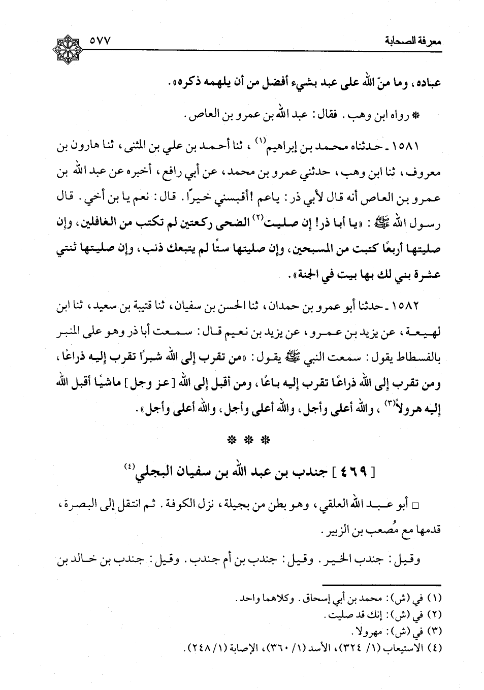 ١٥٨١ - حَدَّثَنَاهُ مُحَمَّدُ بْنُ إِبْرَاهِيمَ، ثنا أَحْمَدُ بْنُ عَلِيِّ بْنِ الْمُثَنَّى، ثنا هَارُونُ بْنُ مَعْرُوفٍ، ثنا ابْنُ وَهْبٍ، حَدَّثَنِي عَمْرُو بْنُ مُحَمَّدٍ، عَنْ أَبِي رَافِعٍ، أَخْبَرَهُ عَنْ عَبْدِ اللهِ بْنِ عَمْرِو بْنِ الْعَاصِ، أَنَّهُ قَالَ لِأَبِي ذَرٍّ: يَا عَمِّ، أَقْبِسْنِي خَيْرًا، قَالَ: نَعَمْ يَا ابْنَ أَخِي، قَالَ رَسُولُ اللهِ صَلَّى اللَّهُ عَلَيْهِ وَسَلَّمَ: «يَا أَبَا ذَرٍّ، إِنْ صَلَّيْتَ الضُّحَى رَكْعَتَيْنِ لَمْ تُكْتَبْ مِنَ الْغَافِلِينَ، وَإِنْ صَلَّيْتَهَا أَرْبَعًا كُتِبْتَ مِنَ الْمُسَبِّحِينَ، وَإِنْ صَلَّيْتَهَا سِتًّا لَمْ يَتْبَعْكَ ذَنْبٌ، وَإِنْ صَلَّيْتَهَا ثِنْتَيْ عَشْرَةَ بُنِي لَكَ بِهَا بَيْتٌ فِي الْجَنَّةِ»