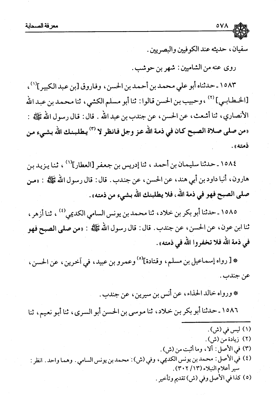١٥٨٣ - حَدَّثَنَاهُ أَبُو عَلِيٍّ، مُحَمَّدُ بْنُ أَحْمَدَ بْنِ الْحَسَنِ، وَفَارُوقُ بْنُ عَبْدِ الْكَبِيرِ الْخَطَّابِيُّ، وَحَبِيبُ بْنُ الْحَسَنِ قَالُوا: ثنا أَبُو مُسْلِمٍ الْكَشِّيُّ، ثنا مُحَمَّدُ بْنُ عَبْدِ اللهِ الْأَنْصَارِيُّ، ثنا أَشْعَثُ، عَنِ الْحَسَنِ، عَن جُنْدُبِ بْنِ عَبْدِ اللهِ، قَالَ: قَالَ رَسُولُ اللهِ صَلَّى اللَّهُ عَلَيْهِ وَسَلَّمَ: «مَنْ صَلَّى صَلَاةَ الصُّبْحِ كَانَ فِي ذِمَّةِ اللهِ عَزَّ وَجَلَّ فَانْظُرْ لَا يَطْلُبَنَّكَ اللهُ بِشَيْءٍ مِنْ ذِمَّتِهِ»