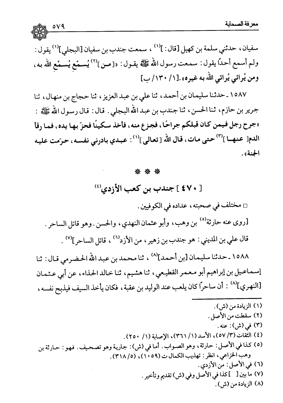١٥٨٨ - حَدَّثَنَا سُلَيْمَانُ بْنُ أَحْمَدَ، ثنا مُحَمَّدُ بْنُ عَبْدِ اللهِ الْحَضْرَمِيُّ، قَالَ: ثنا إِسْمَاعِيلُ بْنُ إِبْرَاهِيمَ أَبُو مَعْمَرٍ الْقَطِيعِيُّ، ثنا هُشَيْمٌ، ثنا خَالِدٌ الْحَذَّاءُ، عَن أَبِي عُثْمَانَ النَّهْرِيِّ، أَنَّ، سَاحِرًا، كَانَ يَلْعَبُ عِنْدَ الْوَلِيدِ بْنِ عُقْبَةَ، فَكَانَ يَأْخُذُ السَّيْفَ فَيَذْبَحُ نَفْسَهُ، ⦗٥٨٠⦘ وَيَعْمَلُ كَذَا، وَلَا يَضُرُّهُ، فَقَامَ جُنْدُبُ إِلَى السَّيْفِ فَأَخَذَهُ، فَضَرَبَ عُنُقَهُ، ثُمَّ قَرَأَ: " {أَفَتَأْتُونَ السِّحْرَ وَأَنْتُمْ تُبْصِرُونَ} [الأنبياء: ٣] " وَرَوَاهُ خَالِدٌ الْعَبْدِيُّ، عَنِ الْحَسَنِ، عَنْ جُنْدُبٍ، فَرَفَعَهُ