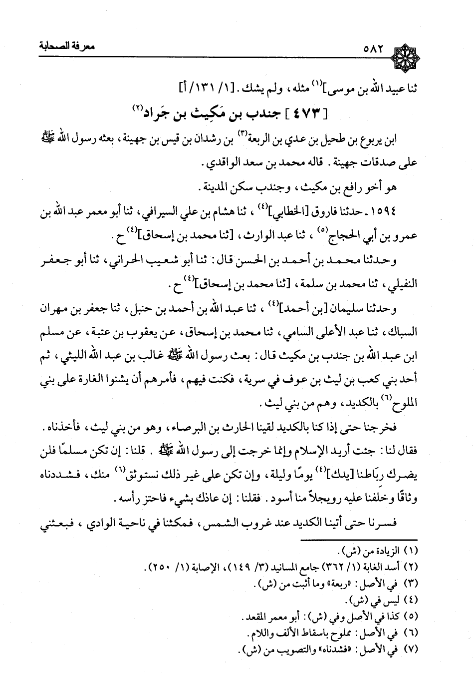 ١٥٩٤ - حَدَّثَنَا فَارُوقٌ الْخَطَّابِيُّ، ثنا هِشَامُ بْنُ عَلِيٍّ السِّيرَافِيُّ، ثنا أَبُو مَعْمَرٍ عَبْدُ اللهِ بْنُ عَمْرِو بْنِ أَبِي الْحَجَّاجِ، ثنا عَبْدُ الْوَارِثِ، ثنا مُحَمَّدُ بْنُ إِسْحَاقَ، ح، وَحَدَّثَنَا مُحَمَّدُ بْنُ أَحْمَدَ بْنِ الْحَسَنِ، قَالَ: ثنا أَبُو شُعَيْبٍ الْحَرَّانِيُّ، ثنا أَبُو جَعْفَرٍ النُّفَيْلِيُّ، ثنا مُحَمَّدُ بْنُ سَلَمَةَ، ثنا مُحَمَّدُ بْنُ إِسْحَاقَ، ح وَحَدَّثَنَا سُلَيْمَانُ بْنُ أَحْمَدَ، ثنا عَبْدُ اللهِ بْنُ أَحْمَدَ بْنِ حَنْبَلٍ، ثنا جَعْفَرُ بْنُ مِهْرَانَ السَّبَّاكُ، ثنا عَبْدُ الْأَعْلَى السَّامِيُّ، ثنا مُحَمَّدُ بْنُ إِسْحَاقَ، عَنْ يَعْقُوبَ بْنِ عُتْبَةَ، عَن مُسْلِمِ بْنِ عَبْدِ اللهِ بْنِ جُنْدُبٍ عَنْ جُنْدُبِ بْنِ مَكِيثٍ، قَالَ: " بَعَثَ رَسُولُ اللهِ صَلَّى اللَّهُ عَلَيْهِ وَسَلَّمَ غَالِبَ بْنَ عَبْدِ اللهِ اللَّيْثِيَّ، ثُمَّ أَحَدُ بَنِي كَعْبِ بْنِ لَيْثِ بْنِ عَوْفٍ فِي سَرِيَّةٍ، فَكُنْتُ فِيهِمْ، فَأَمَرَهُمْ أَنْ يَشُنُّوا الْغَارَةَ عَلَى بَنِي الْمُلَوَّحِ بِالْكَدِيدِ، وَهُمْ مِنْ بَنِي لَيْثٍ، فَخَرَجْنَا حَتَّى إِذَا كُنَّا بِالْكَدِيدِ لَقِينَا الْحَارِثَ بْنَ الْبَرْصَاءِ، وَهُوَ مِنْ بَنِي لَيْثٍ، فَأَخَذْنَاهُ، فَقَالَ لَنَا: جِئْتُ أُرِيدُ الْإِسْلَامَ وَإِنَّمَا خَرَجْتُ إِلَى رَسُولِ اللهِ صَلَّى اللَّهُ عَلَيْهِ وَسَلَّمَ، قُلْنَا: إِنْ تَكُنْ مُسْلِمًا فَلَنْ يَضُرَّكَ رِبَاطُنَا يَدَكَ يَوْمًا وَلَيْلَةً، وَإِنْ تَكُنْ عَلَى غَيْرِ ذَلِكَ نَسْتَوْثِقُ مِنْكَ، فَشَدَدْنَاهُ وِثَاقًا وَخَلَّفْنَا عَلَيْهِ رُوَيْجِلًا مِنَّا أَسْوَدَ، فَقُلْنَا: إِنْ عَاذَكَ بِشَيْءٍ فَاحْتَزَّ رَأْسَهُ، فَسِرْنَا حَتَّى أَتَيْنَا الْكَدِيدَ عِنْدَ غُرُوبِ الشَّمْسِ، فَمَكَثْنَا فِي نَاحِيَةِ الْوَادِي، فَبَعَثَنِي ⦗٥٨٣⦘ أَصْحَابِي رَبِيئَةً لَهُمْ، فَخَرَجْتُ حَتَّى آتِيَ تَلًّا مُشْرِفًا عَلَى الْحَاضِرِ مَطْلَعِي عَلَيْهِمْ، فَلَمَّا أَسْنَدْتُ فِيهِ عَلَوْتُ عَلَى رَأْسِهِ، ثُمَّ اضْطَجَعْتُ عَلَيْهِ، فَإِنِّي لَأَنْظُرُ إِذْ خَرَجَ رَجُلٌ مِنْهُمْ مِنْ خِبَائِهِ، فَقَالَ لِامْرَأَتِهِ: إِنِّي أَرَى عَلَى هَذَا الْجَبَلِ سَوَادًا مَا رَأَيْتُهُ أَوَّلَ مِنْ يَوْمِي هَذَا، فَانْظُرِي إِلَى أَوْعِيَتِكِ أَلَّا تَكُونَ الْكِلَابُ جَرَّتْ مِنْهَا شَيْئًا، فَنَظَرَتْ، فَقَالَتْ: وَاللهِ مَا أَفْقِدُ مِنْ أَوْعِيَتِي شَيْئًا، قَالَ: فَنَاوِلِينِي قَوْسِي وَنَبْلِي، فَنَاوَلَتْهُ قَوْسَهُ وَسَهْمَيْنِ مَعَهَا، فَأَرْسَلَ سَهْمًا، وَاللهِ مَا أَخْطَأَ بَيْنَ عَيْنَيَّ، فَانْتَزَعْتُهُ وَثَبَتُّ، قَالَ: ثُمَّ أَرْسَلَ سَهْمًا آخَرَ فَوَضَعَهُ فِي مَنْكِبِي، فَانْتَزَعْتُهُ وَثَبَتُّ. فَقَالَ لِأَمَتِهِ: وَاللهِ لَوْ كَانَتْ زَائِلَةً، لَقَدْ تَحَرَّكَتْ بَعْدُ، لَقَدْ خَالَطَهَا سَهْمَايَ، فَانْظُرِيهِمَا لَا أَبَا لَكِ إِذَا أَصْبَحْتِ لَا يَمْضُغُهَا الْكِلَابُ، قَالَ: وَدَخَلَ قَالَ: وَرَاحَتِ الْمَاشِيَةُ مِنْ إِبِلِهِمْ وَأَغْنَامِهِمْ، قَالَ: فَلَمَّا احْتَلَبُوا وَعَطَنُوا وَاطْمَأَنُّوا، فَنَامُوا شَنَنَّا، وَاسْتَقْنَا النَّعَمَ، وَخَرَجَ صَرِيخُ الْقَوْمِ فِي قَوْمِهِمْ، فَجَاءَ مَا لَا قِبَلَ لَنَا بِهِ، خَرَجْنَا بِهَذَا نَحْذَرُهَا، حَتَّى مَرَرْنَا بِابْنِ الْبَرْصَاءِ، فَاحْتَمَلْنَاهُ وَاحْتَمَلْنَا صَاحِبَنَا، فَأَدْرَكَنَا الْقَوْمُ حَتَّى نَظَرُوا إِلَيْنَا، مَا بَيْنَنَا وَبَيْنَهُمْ إِلَّا الْوَادِي، وَنَحْنُ مَوَجَّهُونَ فِي نَاحِيَةِ الْوَادِي، إِذْ جَاءَ اللهُ بِالْوَادِي مِنْ حَيْثُ شَاءَ يَمْلَأ جَنْبَتَيْهِ مَاءً، وَاللهِ مَا رَأَيْنَا يَوْمَئِذٍ