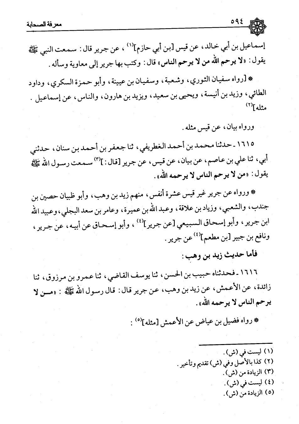 ١٦١٥ - حَدَّثَنَا مُحَمَّدُ بْنُ أَحْمَدَ الْغِطْرِيفِيُّ، ثنا جَعْفَرُ بْنُ أَحْمَدَ بْنِ سِنَانٍ، حَدَّثَنِي أَبِي، ثنا عَلِيُّ بْنُ عَاصِمٍ، عَنْ بَيَانٍ، عَنْ قَيْسٍ، عَن جَرِيرٍ، قَالَ: سَمِعْتُ رَسُولَ اللهِ صَلَّى اللَّهُ عَلَيْهِ وَسَلَّمَ يَقُولُ: «مَنْ لَا يَرْحَمُ النَّاسَ لَا يَرْحَمُهُ اللهُ» وَرَوَاهُ عَنْ جَرِيرٍ غَيْرُ قَيْسٍ عَشْرَةُ أَنْفُسٍ، مِنْهُمْ زَيْدُ بْنُ وَهْبٍ، وَأَبُو ظَبْيَانَ حُصَيْنُ بْنُ جُنْدُبٍ، وَالشَّعْبِيُّ، وَزِيَادُ بْنُ عِلَاقَةَ، وَعَبْدُ اللهِ بْنُ عَمِيرَةَ، وَعَامِرُ بْنُ سَعْدٍ الْبَجَلِيُّ، وَعُبَيْدُ اللهِ بْنُ جَرِيرٍ، وَأَبُو إِسْحَاقَ السَّبِيعِيُّ، عَنْ جَرِيرٍ، وَأَبُو إِسْحَاقَ، عَنْ أَبِيهِ، عَنْ جَرِيرٍ، وَنَافِعُ بْنُ جُبَيْرِ بْنِ مُطْعِمٍ، عَنْ جَرِيرٍ