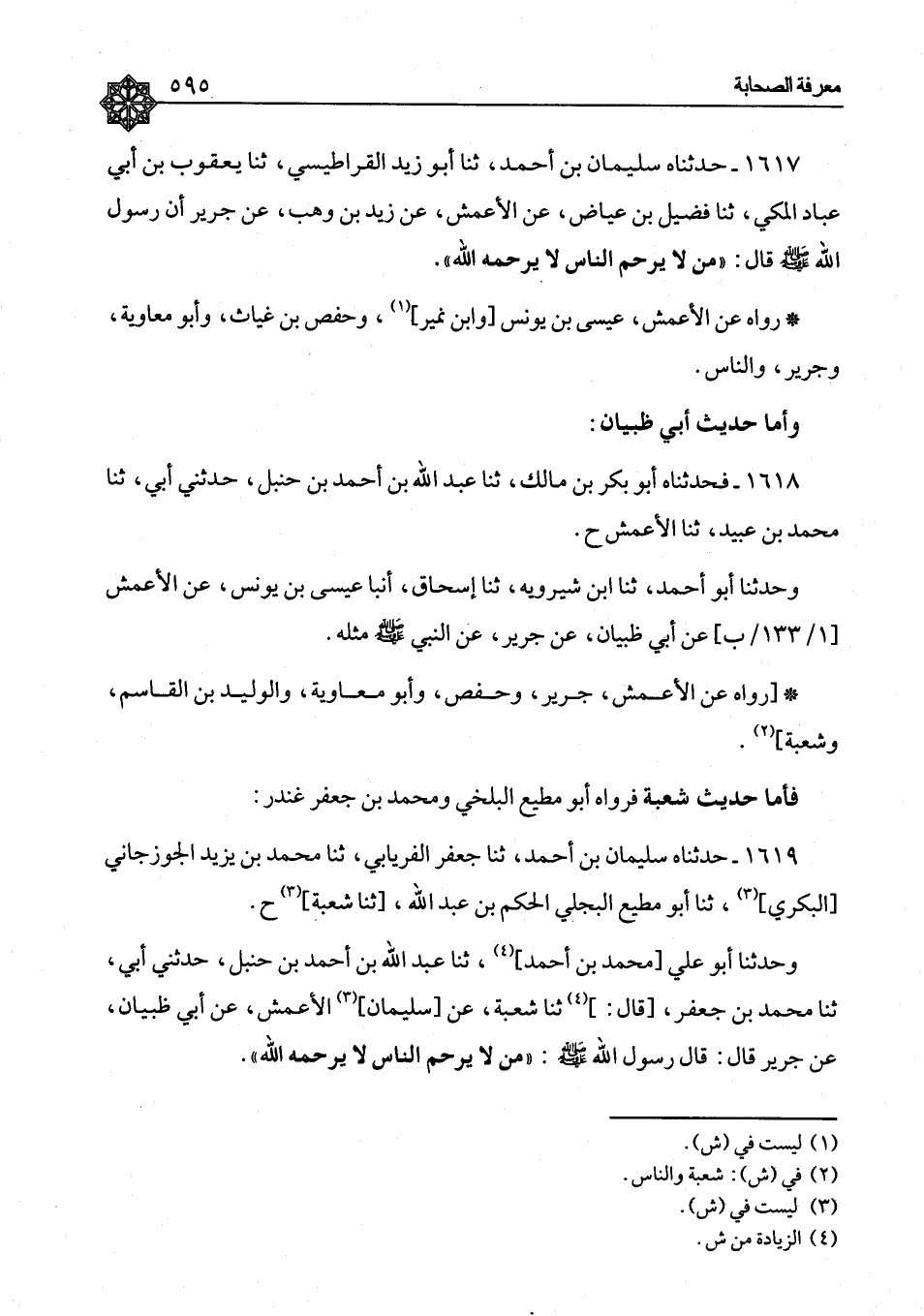 وَحَدَّثَنَا أَبُو عَلِيٍّ مُحَمَّدُ بْنُ أَحْمَدَ، ثنا عَبْدُ اللهِ بْنُ أَحْمَدَ بْنِ حَنْبَلٍ، حَدَّثَنِي أَبِي، ثنا مُحَمَّدُ بْنُ جَعْفَرٍ، قَالَ: ثنا شُعْبَةُ، عَنْ سُلَيْمَانَ الْأَعْمَشِ، عَنْ أَبِي ظَبْيَانَ، عَن جَرِيرٍ، قَالَ: قَالَ رَسُولُ اللهِ صَلَّى اللَّهُ عَلَيْهِ وَسَلَّمَ: «مَنْ لَا يَرْحَمُ النَّاسَ لَا يَرْحَمُهُ اللهُ»