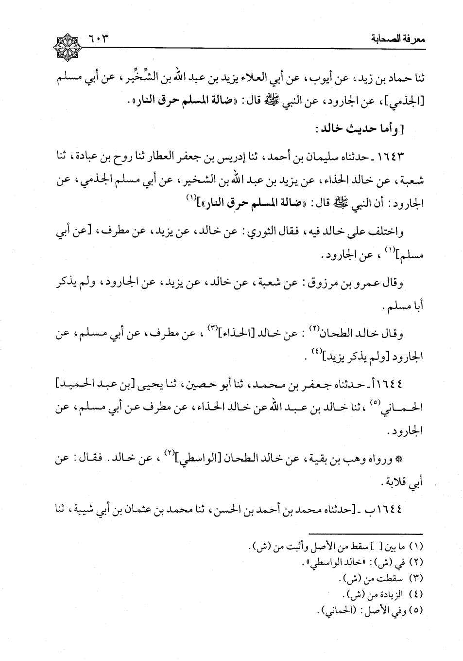 ١٦٤٤ - حَدَّثَنَاهُ جَعْفَرُ بْنُ مُحَمَّدٍ، ثنا أَبُو حُصَيْنٍ، ثنا يَحْيَى بْنُ عَبْدِ الْحَمِيدِ الْحِمَّانِيُّ، ثنا خَالِدُ بْنُ عَبْدِ اللهِ، عَنْ خَالِدٍ الْحَذَّاءِ، عَنْ مُطَرِّفٍ، عَنْ أَبِي مُسْلِمٍ، عَنِ الْجَارُودِ. وَرَوَاهُ وَهْبُ بْنُ بَقِيَّةَ، عَنْ خَالِدٍ الطَّحَّانِ الْوَاسِطِيِّ، عَنْ خَالِدٍ، فَقَالَ: عَنْ أَبِي قِلَابَةَ