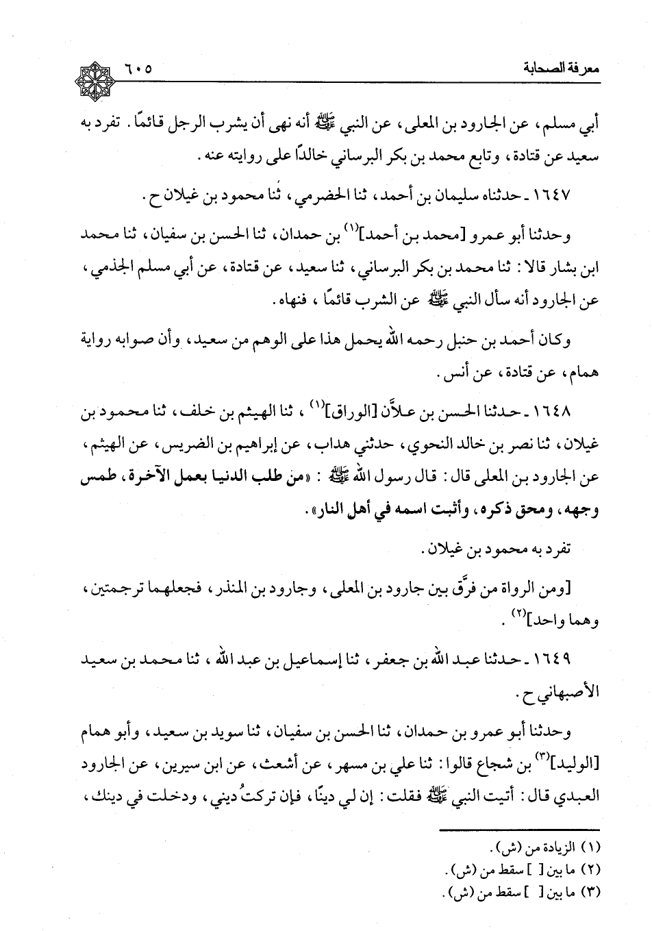 ١٦٤٨ - حَدَّثَنَا الْحَسَنُ بْنُ عَلَّانَ الْوَرَّاقُ، ثنا الْهَيْثَمُ بْنُ خَلَفٍ، ثنا مَحْمُودُ بْنُ غَيْلَانَ، ثنا نَصْرُ بْنُ خَالِدٍ النَّحْوِيُّ، حَدَّثَنِي هَدَّابٌ، عَنْ إِبْرَاهِيمَ بْنِ الضُّرَيْسِ، عَنِ الْهَيْثَمِ، عَن الْجَارُودِ بْنِ الْمُعَلَّى، قَالَ: قَالَ رَسُولُ اللهِ صَلَّى اللَّهُ عَلَيْهِ وَسَلَّمَ: «مَنْ طَلَبَ الدُّنْيَا بِعَمَلِ الْآخِرَةِ، طُمِسَ وَجْهُهُ، وَمُحِقَ ذِكْرُهُ، وَأُثْبِتَ اسْمُهُ فِي أَهْلِ النَّارِ» تَفَرَّدَ بِهِ مَحْمُودُ بْنُ غَيْلَانَ. وَمِنَ الرُّوَاةِ مَنْ فَرَّقَ بَيْنَ جَارُودِ بْنِ الْمُعَلَّى، وَجَارُودِ بْنِ الْمُنْذِرِ فَجَعَلَهُمَا تَرْجَمَتَيْنِ وَهُمَا وَاحِدٌ