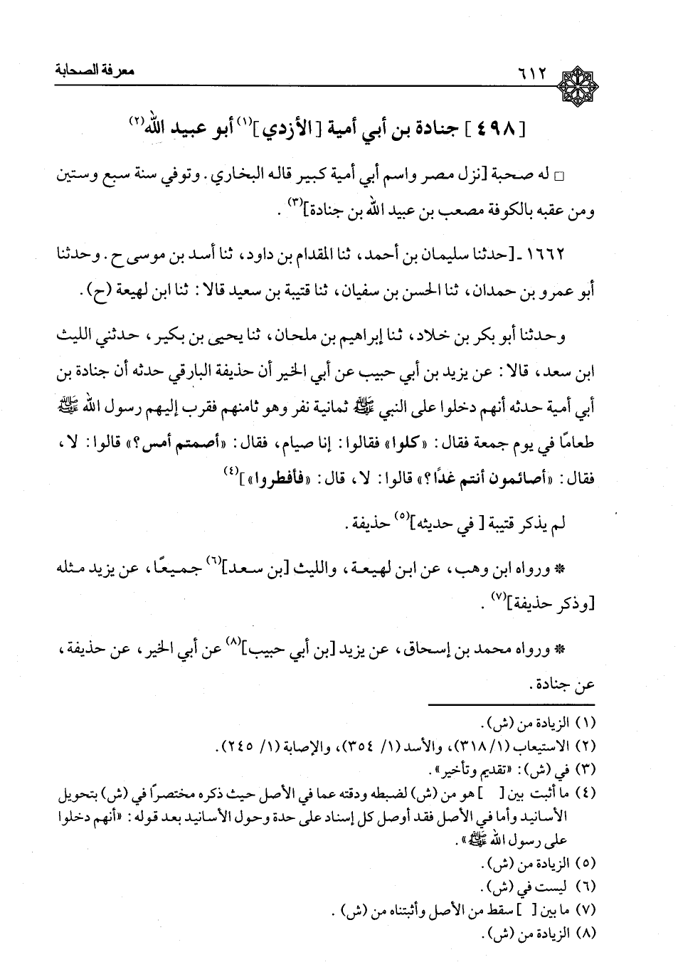 ١٦٦٢ - حَدَّثَنَا سُلَيْمَانُ بْنُ أَحْمَدَ، ثنا الْمِقْدَامُ بْنُ دَاوُدَ، ثنا أَسَدُ بْنُ مُوسَى، ح وَحَدَّثَنَا أَبُو عَمْرِو بْنُ حَمْدَانَ، ثنا الْحَسَنُ بْنُ سُفْيَانَ، ثنا قُتَيْبَةُ بْنُ سَعِيدٍ، قَالَا: ثنا ابْنُ لَهِيعَةَ، ح وَحَدَّثَنَا أَبُو بَكْرِ بْنُ خَلَّادٍ، ثنا إِبْرَاهِيمُ بْنُ مِلْحَانَ، ثنا يَحْيَى بْنُ بُكَيْرٍ، حَدَّثَنِي اللَّيْثُ بْنُ سَعْدٍ، قَالَا: عَنْ يَزِيدَ بْنِ أَبِي حَبِيبٍ، عَنْ أَبِي الْخَيْرِ، أَنَّ حُذَيْفَةَ الْبَارِقِيَّ، حَدَّثَهُ أَنَّ جُنَادَةَ بْنَ أَبِي أُمَيَّةَ حَدَّثَهُ أَنَّهُمْ، دَخَلُوا عَلَى النَّبِيِّ صَلَّى اللَّهُ عَلَيْهِ وَسَلَّمَ ثَمَانِيَةَ نَفَرٍ وَهُوَ ثَامِنُهُمْ فَقَرَّبَ إِلَيْهِمْ رَسُولُ اللهِ صَلَّى اللَّهُ عَلَيْهِ وَسَلَّمَ طَعَامًا فِي يَوْمِ جُمُعَةٍ فَقَالَ: «كُلُوا» فَقَالُوا: إِنَّا صِيَامٌ، فَقَالَ: «أَصُمْتُمْ أَمْسِ؟» قَالُوا: لَا، فَقَالَ: «أَصَائِمُونَ أَنْتُمْ غَدًا؟» قَالُوا: لَا، قَالَ: «فَأَفْطِرُوا» لَمْ يَذْكُرْ قُتَيْبَةُ فِي حَدِيثِهِ حُذَيْفَةَ. وَرَوَاهُ ابْنُ وَهْبٍ، عَنِ ابْنِ لَهِيعَةَ، وَاللَّيْثِ بْنِ سَعْدٍ جَمِيعًا، عَنْ يَزِيدَ مِثْلَهُ وَذَكَرَ حُذَيْفَةَ. وَرَوَاهُ مُحَمَّدُ بْنُ إِسْحَاقَ، عَنْ يَزِيدَ بْنِ أَبِي حَبِيبٍ، عَنْ أَبِي الْخَيْرِ، عَنْ حُذَيْفَةَ، عَنْ جُنَادَةَ