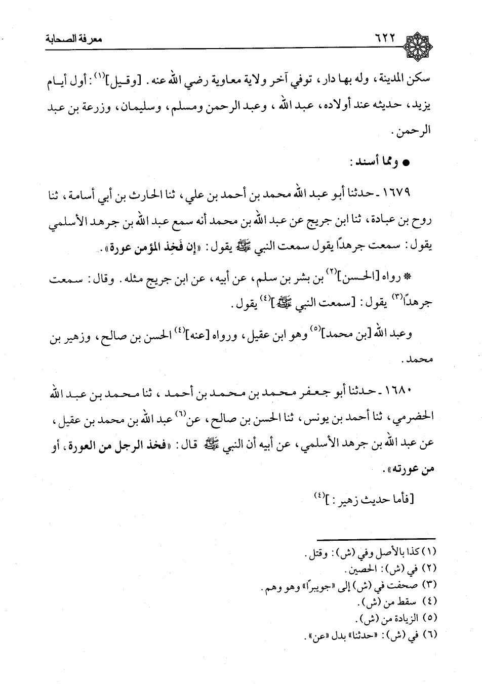١٦٧٩ - وَمِمَّا أَسْنَدَ حَدَّثَنَا أَبُو عَبْدِ اللهِ، مُحَمَّدُ بْنُ أَحْمَدَ بْنِ عَلِيٍّ، ثنا الْحَارِثُ بْنُ أَبِي أُسَامَةَ، ثنا رَوْحُ بْنُ عُبَادَةَ، ثنا ابْنُ جُرَيْحٍ، عَنْ عَبْدِ اللهِ بْنِ مُحَمَّدٍ، أَنَّهُ سَمِعَ عَبْدَ اللهِ بْنَ جَرْهَدٍ الْأَسْلَمِيَّ، يَقُولُ: سَمِعْتُ جَرْهَدًا، يَقُولُ سَمِعْتُ النَّبِيَّ صَلَّى اللَّهُ عَلَيْهِ وَسَلَّمَ يَقُولُ: «إِنَّ فَخِذَ الْمُؤْمِنِ عَوْرَةٌ» رَوَاهُ الْحَسَنُ بْنُ بِشْرِ بْنِ سَلْمٍ، عَنْ أَبِيهِ، عَنِ ابْنِ جُرَيْجٍ مِثْلَهُ. وَقَالَ: سَمِعْتُ جَرْهَدًا يَقُولُ: سَمِعْتُ النَّبِيَّ صَلَّى اللَّهُ عَلَيْهِ وَسَلَّمَ يَقُولُ. وَعَبْدُ اللهِ بْنُ مُحَمَّدٍ وَهُوَ ابْنُ عَقِيلٍ، وَرَوَاهُ عَنْهُ الْحَسَنُ بْنُ صَالِحٍ، وَزُهَيْرُ بْنُ مُحَمَّدٍ
