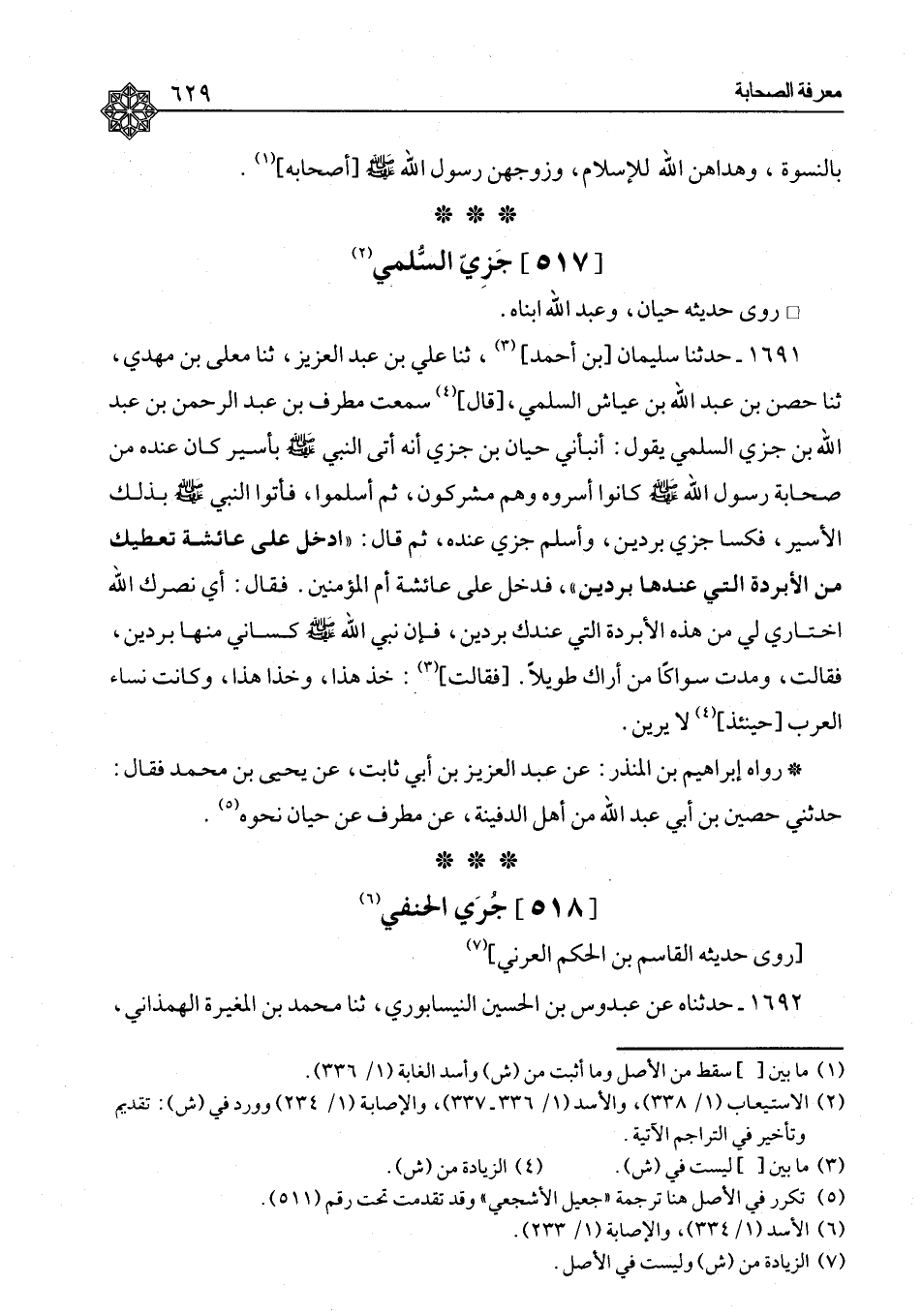 ١٦٩١ - حَدَّثَنَا سُلَيْمَانُ بْنُ أَحْمَدَ، ثنا عَلِيُّ بْنُ عَبْدِ الْعَزِيزِ، ثنا مُعَلَّى بْنُ مَهْدِيٍّ، ثنا حِصْنُ بْنُ عَبْدِ اللهِ بْنِ عَيَّاشٍ السُّلَمِيُّ، قَالَ: سَمِعْتُ مُطَرِّفَ بْنَ عَبْدِ الرَّحْمَنِ بْنِ عَبْدِ اللهِ بْنِ جَزِيٍّ السُّلَمِيَّ، يَقُولُ: أَنْبَأَنِي حَيَّانُ بْنُ جَزِيٍّ، أَنَّهُ أَتَى النَّبِيَّ صَلَّى اللَّهُ عَلَيْهِ وَسَلَّمَ بِأَسِيرٍ كَانَ عِنْدَهُ مِنْ صَحَابَةِ رَسُولِ اللهِ صَلَّى اللَّهُ عَلَيْهِ وَسَلَّمَ كَانُوا أَسَرُوهُ وَهُمْ مُشْرِكُونَ، ثُمَّ أَسْلَمُوا، فَأَتَوَا النَّبِيَّ صَلَّى اللَّهُ عَلَيْهِ وَسَلَّمَ بِذَلِكَ الْأَسِيرِ، فَكَسَا جَزِيًّا بُرْدَيْنِ، وَأَسْلَمَ جَزِيٌّ عِنْدَهُ، ثُمَّ قَالَ: «ادْخُلْ عَلَى عَائِشَةَ تُعْطِيكَ مِنَ الْأَبْرِدَةِ الَّتِي عِنْدَهَا بُرْدَيْنِ» ، فَدَخَلَ عَلَى عَائِشَةَ أُمِّ الْمُؤْمِنِينَ، فَقَالَ: أَيْ نَصْرَكِ اللهُ اخْتَارِي لِي مِنْ هَذِهِ الْأَبْرِدَةِ الَّتِي عِنْدَكِ بُرْدَيْنِ، فَإِنَّ نَبِيَّ اللهِ صَلَّى اللَّهُ عَلَيْهِ وَسَلَّمَ كَسَانِي مِنْهَا بُرْدَيْنِ، فَقَالَتْ: وَمَدَّتْ سِوَاكًا مِنْ أَرَاكٍ طَوِيلًا، فَقَالَتْ: خُذْ هَذَا، وَخُذْ هَذَا، وَكَانَتْ نِسَاءُ الْعَرَبِ حِينَئِذٍ لَا يُرَيْنَ " رَوَاهُ إِبْرَاهِيمُ بْنُ الْمُنْذِرِ عَنْ عَبْدِ الْعَزِيزِ بْنِ أَبِي ثَابِتٍ، عَنْ يَحْيَى بْنِ مُحَمَّدٍ فَقَالَ: حَدَّثَنِي حُصَيْنُ بْنُ أَبِي عَبْدِ اللهِ مِنْ أَهْلِ الدُّفَيْنَةِ، عَنْ مُطَرِّفٍ، عَنْ حَيَّانَ نَحْوَهُ