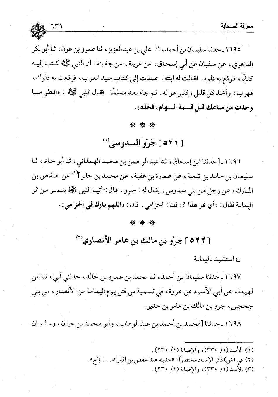 ١٦٩٨ - حَدَّثَنَا مُحَمَّدُ بْنُ أَحْمَدَ بْنِ عَبْدِ الْوَهَّابِ، وَأَبُو مُحَمَّدِ بْنُ حَيَّانَ، وَسُلَيْمَانُ ⦗٦٣٢⦘ بْنُ أَحْمَدَ قَالُوا: ثنا الْحَسَنُ بْنُ هَارُونَ، ثنا مُحَمَّدُ بْنُ إِسْحَاقَ الْمُسَيَّبِيُّ، ثنا مُحَمَّدُ بْنُ فُلَيْحٍ، عَنْ مُوسَى بْنِ عُقْبَةَ، عَن ابْنِ شِهَابٍ، «فِي تَسْمِيَةِ مَنِ اسْتُشْهِدَ يَوْمَ الْيَمَامَةِ مِنَ الْأَنْصَارِ مِنَ الْأَوْسِ، ثُمَّ مِنْ بَنِي عَمْرِو بْنِ عَوْفٍ، جَرْوُ بْنُ مَالِكٍ»