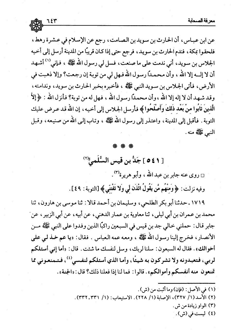 جِدُّ بْنُ قَيْسٍ السُّلَمِيُّ رَوَى عَنْهُ جَابِرُ بْنُ عَبْدِ اللهِ، وَأَبُو هُرَيْرَةَ وَفِيهِ نَزَلَتْ: {وَمِنْهُمْ مَنْ يَقُولُ ائْذَنْ لِي وَلَا تَفْتِنِّي} [التوبة: ٤٩]