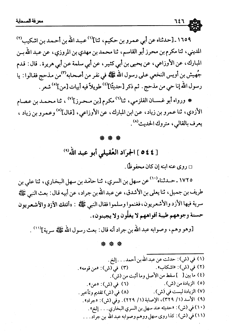 ١٧٢٥ - حُدِّثْنَاهُ، عَنْ سَهْلِ بْنِ السَّرِيِّ، ثنا حَامِدُ بْنُ سَهْلٍ الْبُخَارِيُّ، ثنا عَلِيُّ بْنُ طَرِيفِ بْنِ جَمِيلٍ، ثنا يَعْلَى بْنُ الْأَشْدَقِ، عَنْ عَبْدِ اللهِ بْنِ جَرَادٍ، عَنْ أَبِيهِ، قَالَ: بَعَثَ النَّبِيُّ صَلَّى اللَّهُ عَلَيْهِ وَسَلَّمَ فِي سَرِيَّةٍ فِيهَا الْأَزْدُ وَالْأَشْعَرِيُّونَ، فَغَنِمُوا وَسَلِمُوا فَقَالَ النَّبِيُّ صَلَّى اللَّهُ عَلَيْهِ وَسَلَّمَ: «أَتَتْكَ الْأَزْدُ وَالْأَشْعَرِيُّونَ حَسَنَةٌ وُجُوهُهُمْ طَيِّبَةٌ أَفْوَاهُهُمْ , لَا يَغُلُّونَ وَلَا يَجْبُنُونَ» وَهُوَ وَهْمٌ، وَصَوَابُهُ عَبْدُ اللهِ بْنُ جَرَادٍ أَنَّهُ قَالَ: بَعَثَ رَسُولُ اللهِ صَلَّى اللَّهُ عَلَيْهِ وَسَلَّمَ سَرِيَّةً