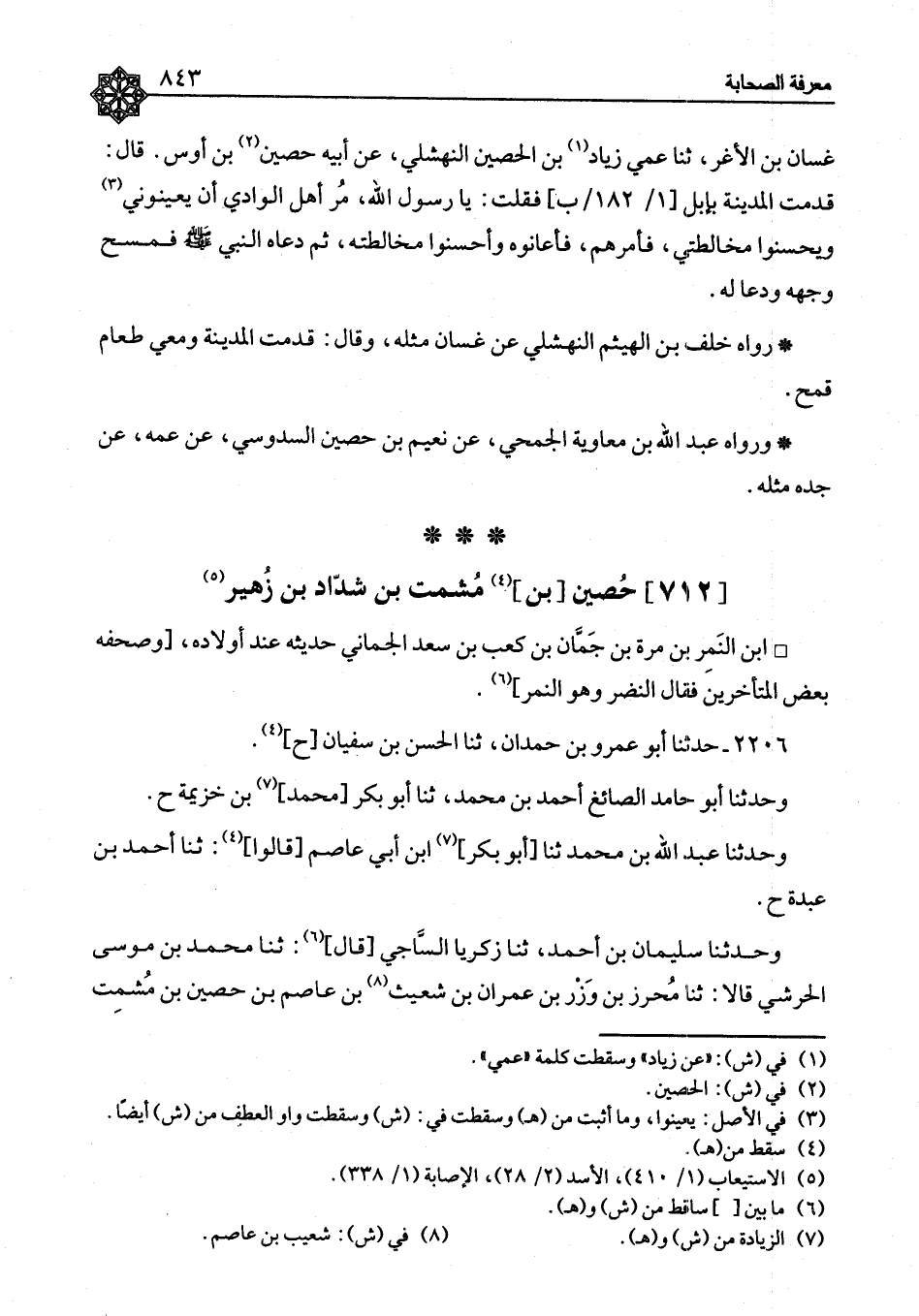 ٢٢٠٦ - حَدَّثَنَا أَبُو عَمْرِو بْنُ حَمْدَانَ، ثنا الْحَسَنُ بْنُ سُفْيَانَ، ح وَحَدَّثَنَا أَبُو حَامِدٍ الصَّائِغُ أَحْمَدُ بْنُ مُحَمَّدٍ، ثنا أَبُو بَكْرٍ مُحَمَّدُ بْنُ خُزَيْمَةَ ح وَحَدَّثَنَا عَبْدُ اللهِ بْنُ مُحَمَّدٍ، ثنا أَبُو بَكْرِ بْنُ أَبِي عَاصِمٍ، قَالُوا: ثنا أَحْمَدُ بْنُ عَبْدَةَ ح وَحَدَّثَنَا سُلَيْمَانُ بْنُ أَحْمَدَ، ثنا زَكَرِيَّا السَّاجِيُّ، قَالَ: ثنا مُحَمَّدُ بْنُ مُوسَى الْحَرَشِيُّ، قَالَا: ثنا مُحْرِزُ بْنُ وَزْرِ بْنِ عِمْرَانَ بْنِ شُعَيْثِ بْنِ عَاصِمِ بْنِ حُصَيْنِ بْنِ مُشْمِتِ ⦗٨٤٤⦘ بْنِ شَدَّادِ بْنِ النَّمِرِ بْنِ مُرَّةَ بْنِ جُمَانَ، حَدَّثَنِي أَبِي وَزْرٌ، أَنَّ أَبَاهُ عِمْرَانَ حَدَّثَهُ أَنَّ أَبَاهُ شُعَيْثًا حَدَّثَهُ أَنَّ أَبَاهُ عَاصِمًا حَدَّثَهُ" أَنَّ أَبَاهُ حُصَيْنًا حَدَّثَهُ أَنَّهُ وَفَدَ إِلَى رَسُولِ اللهِ صَلَّى اللَّهُ عَلَيْهِ وَسَلَّمَ فَبَايَعَهُ بَيْعَةَ الْإِسْلَامِ، وَصَدَّقَ إِلَيْهِ صَدَقَةَ مَالِهِ وَأَقْطَعَهُ النَّبِيُّ صَلَّى اللَّهُ عَلَيْهِ وَسَلَّمَ مِيَاهًا عِدَّةً بِالْمِرْوَثِ، وَإِسْنَادُ جَرَادٍ مِنْهَا أُصَيْهِيبٌ وَمِنْهَا الْمَاعِزَةُ وَمِنْهَا أَهْوَاءٌ وَمِنْهَا الثِّمَادُ وَمِنْهَا السَّدِيرَةُ وَشَرْطَ لِحُصَيْنِ بْنِ مُشْمِتٍ، فِيمَا قُطِعَ لَهُ أَنْ لَا يُعْقَرَ مَرْعَاهُ وَلَا يُبَاعَ مَاؤُهُ، وَشَرَطَ عَلَى حُصَيْنِ بْنِ مُشْمِتٍ أَنْ لَا يَبِيعَ مَاءَهُ وَلَا يَمْنَعَ فَضْلَهُ فَقَالَ زُهَيْرُ بْنُ عَاصِمِ بْنِ حُصَيْنٍ: