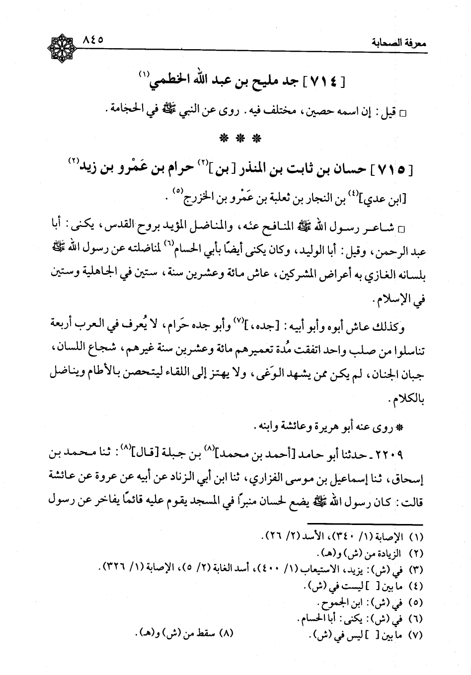 حَسَّانُ بْنُ ثَابِتِ بْنِ الْمُنذِرِ بْنِ حَرَامِ بْنِ عَمْرِو بْنِ زَيْدِ بْنِ عَدِيِّ بْنِ النَّجَّارِ بْنِ ثَعْلَبَةَ بْنِ عَمْرِو بْنِ الْخَزْرَجِ شَاعِرُ رَسُولِ اللهِ صَلَّى اللَّهُ عَلَيْهِ وَسَلَّمَ الْمُنَافِحُ عَنْهُ، وَالْمُنَاضِلُ الْمُؤَيَّدُ بِرُوحِ الْقُدُّوسِ، يُكَنَّى: أَبَا عَبْدِ الرَّحْمَنِ، وَقِيلَ: أَبَا الْوَلِيدِ، وَكَانَ يُكَنَّى أَيْضًا بِأَبِي الْحُسَامِ لِمُنَاضَلَتِهِ عَنْ رَسُولِ اللهِ صَلَّى اللَّهُ عَلَيْهِ وَسَلَّمَ بِلِسَانِهِ الْغَازِي بِهِ أَعْرَاضَ الْمُشْرِكِينَ، عَاشَ مِائَةً وَعِشْرِينَ سَنَةً، سِتِّينَ فِي الْجَاهِلِيَّةِ وَسِتِّينَ فِي الْإِسْلَامِ، وَكَذَلِكَ عَاشَ أَبُوهُ وَأَبُو أَبِيهِ: جَدُّهُ وَأَبُو جَدِّهِ حَرَامٌ، لَا يُعْرَفُ فِي الْعَرَبِ أَرْبَعَةٌ تَنَاسَلُوا مِنْ صُلْبٍ وَاحِدٍ اتَّفَقَتْ مُدَّةُ تَعْمِيرِهِمْ مِائَةً وَعِشْرِينَ سَنَةً غَيْرُهُمْ، شُجَاعُ اللِّسَانِ، جَبَانُ الْجَنَانِ، لَمْ يَكُنْ مِمَّنْ يَشْهَدُ الْوَغَى، وَلَا يَهْتَزُّ إِلَى اللِّقَاءِ لِيَتَحَصَّنَ بِالْآطَامِ وَيُنَاضِلَ بِالْكَلَامِ رَوَى عَنْهُ أَبُو هُرَيْرَةَ، وَعَائِشَةُ، وَابْنُهُ