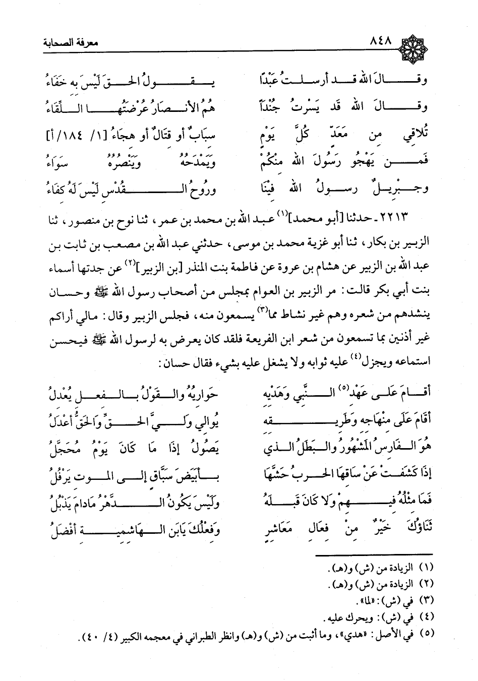 ٢٢١٣ - حَدَّثَنَا أَبُو مُحَمَّدٍ عَبْدُ اللهِ بْنُ مُحَمَّدِ بْنِ عُمَرَ، ثنا نُوحُ بْنُ مَنْصُورٍ، ثنا الزُّبَيْرُ بْنُ بَكَّارٍ، ثنا أَبُو غَزِيَّةَ مُحَمَّدُ بْنُ مُوسَى، حَدَّثَنِي عَبْدُ اللهِ بْنُ مُصْعَبِ بْنِ ثَابِتِ بْنِ عَبْدِ اللهِ بْنِ الْزَّبَيْرِ، عَنْ هِشَامِ بْنِ عُرْوَةَ، عَنْ فَاطِمَةَ بِنْتِ الْمُنْذِرِ بْنِ الزُّبَيْرِ، عَنْ جَدَّتِهَا أَسْمَاءَ بِنْتِ أَبِي بَكْرٍ قَالَتْ: " مَرَّ الزُّبَيْرُ بْنُ الْعَوَّامِ بِمَجْلِسٍ مِنْ أَصْحَابِ رَسُولِ اللهِ صَلَّى اللَّهُ عَلَيْهِ وَسَلَّمَ وَحَسَّانُ يُنْشِدُهُمْ مِنْ شَعْرِهِ وَهُمْ غَيْرُ نُشَاطٍ مِمَّا يَسْمَعُونَ مِنْهُ، فَجَلَسَ الزُّبَيْرُ وَقَالَ: مَالِي أَرَاكُمْ غَيْرَ أَذِنِينَ بِمَا تَسْمَعُونَ مِنْ شِعْرِ ابْنِ الْفُرَيْعَةِ فَلَقَدْ كَانَ يَعْرِضُ بِهِ لِرَسُولِ اللهِ صَلَّى اللَّهُ عَلَيْهِ وَسَلَّمَ فَيُحْسِنُ اسْتِمَاعَهُ وَيُجْزِلُ عَلَيْهِ ثَوَابَهُ وَلَا يُشْغَلُ عَلَيْهِ بِشَيْءٍ فَقَالَ حَسَّانُ: