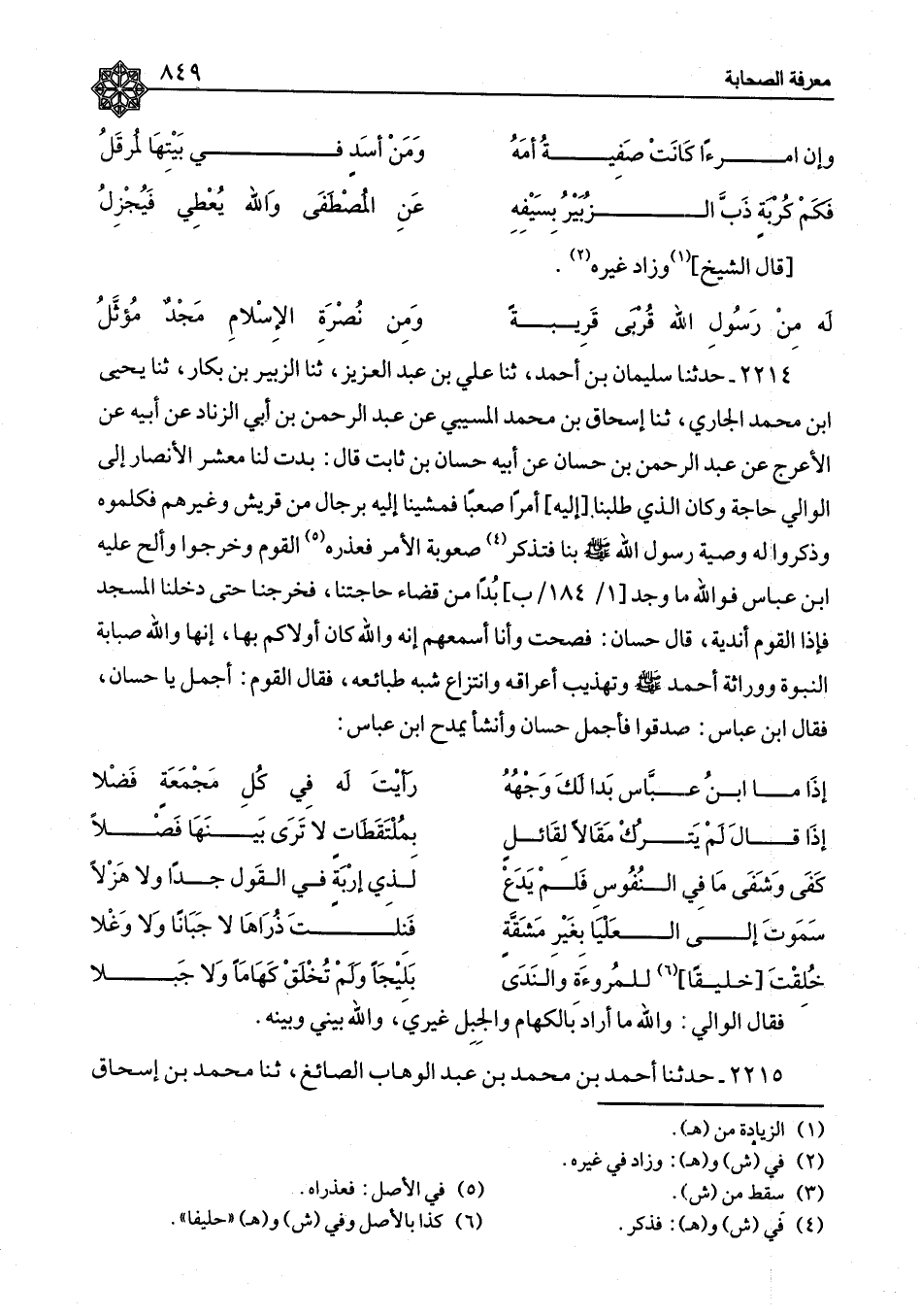 ٢٢١٤ - حَدَّثَنَا سُلَيْمَانُ بْنُ أَحْمَدَ، ثنا عَلِيُّ بْنُ عَبْدِ الْعَزِيزِ، ثنا الزُّبَيْرُ بْنُ بَكَّارٍ، ثنا يَحْيَى بْنُ مُحَمَّدٍ الْجَارِيُّ، ثنا إِسْحَاقُ بْنُ مُحَمَّدٍ الْمُسَيَّبِيُّ، عَنْ عَبْدِ الرَّحْمَنِ بْنِ أَبِي الزِّنَادِ، عَنْ أَبِيهِ، عَنِ الْأَعْرَجِ، عَنْ عَبْدِ الرَّحْمَنِ بْنِ حَسَّانَ، عَنْ أَبِيهِ حَسَّانَ بْنِ ثَابِتٍ قَالَ: " بَدَتْ لَنَا مَعْشَرَ الْأَنْصَارِ إِلَى الْوَالِي حَاجَةٌ وَكَانَ الَّذِي طَلَبْنَا إِلَيْهِ أَمْرًا صَعْبًا فَمَشَيْنَا إِلَيْهِ بِرِجَالٍ مِنْ قُرَيْشٍ وَغَيْرِهِمْ فَكَلَّمُوهُ وَذَكَرُوا لَهُ وَصِيَّةَ رَسُولِ اللهِ صَلَّى اللَّهُ عَلَيْهِ وَسَلَّمَ بِنَا فَتَذَكَّرَ صُعُوبَةَ الْأَمْرِ فَعَذَرَهُ الْقَوْمُ وَخَرَجُوا وَأَلَحَّ عَلَيْهِ ابْنُ عَبَّاسٍ فَوَاللهِ مَا وَجَدَ بُدًّا مِنْ قَضَاءِ حَاجَتِنَا، فَخَرَجْنَا حَتَّى دَخَلْنَا الْمَسْجِدَ فَإِذَا الْقَوْمُ أُنَدِّيَةٌ قَالَ حَسَّانُ: فَصِحْتُ وَأَنَا أَسْمَعَهُمْ إِنَّهُ وَاللهِ كَانَ أَوْلَاكُمْ بِهَا، إِنَّهَا وَاللهِ صُبَابَةُ النُّبُوَّةِ وَوِرَاثَةُ أَحْمَدَ صَلَّى اللَّهُ عَلَيْهِ وَسَلَّمَ وَتَهْذِيبُ أَعْرَاقِهِ وَانْتِزَاعِ شِبْهَ طَبَائِعِهِ، فَقَالَ الْقَوْمُ: أَجْمِلْ يَا حَسَّانُ، فَقَالَ ابْنُ عَبَّاسٍ: صِدْقًا فَأَجْمَلَ حَسَّانُ وَأَنْشَأَ يَمْدَحُ ابْنَ عَبَّاسٍ: