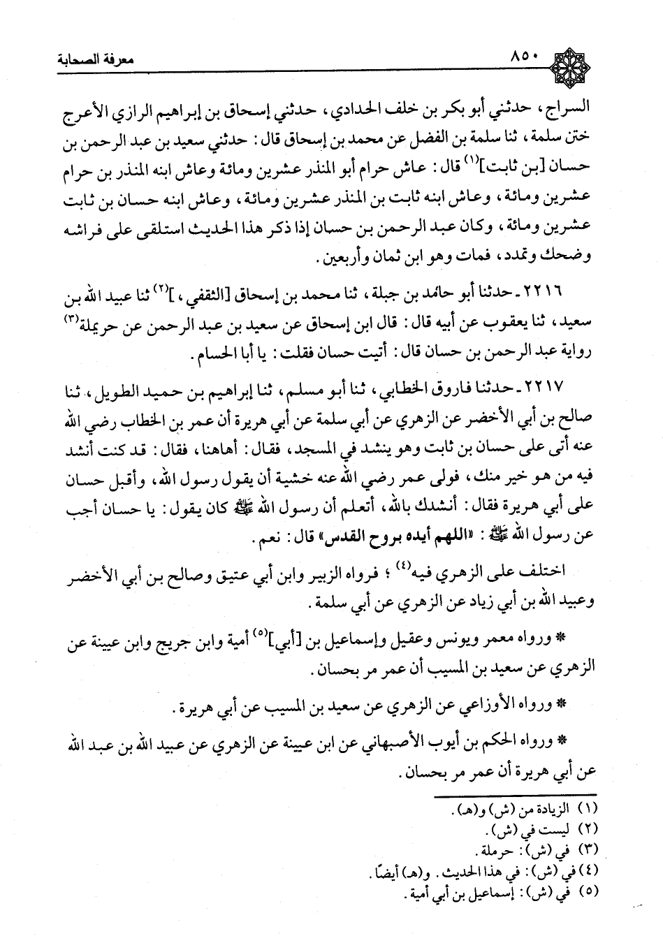 ٢٢١٧ - حَدَّثَنَا فَاروقٌ الْخَطَّابِيُّ، ثنا أَبُو مُسْلِمٍ، ثنا إِبْرَاهِيمُ بْنُ حُمَيْدٍ الطَّوِيلُ، ثنا صَالِحُ بْنُ أَبِي الْأَخْضَرِ، عَنِ الزُّهْرِيِّ، عَنْ أَبِي سَلَمَةَ، عَنْ أَبِي هُرَيْرَةَ، أَنَّ عُمَرَ بْنَ الْخَطَّابِ رَضِيَ اللهُ عَنْهُ أَتَى عَلَى حَسَّانَ بْنِ ثَابِتٍ وَهُوَ يُنْشِدُ فِي الْمَسْجِدِ، فَقَالَ: أَهَاهُنَا، فَقَالَ: قَدْ كُنْتُ أُنْشِدُ فِيهِ مَنْ هُوَ خَيْرٌ مِنْكَ، فَوَلَّى عُمَرُ رَضِيَ اللهُ عَنْهُ خَشْيَةَ أَنْ يَقُولَ: رَسُولُ اللهِ وَأَقْبَلَ حَسَّانُ عَلَى أَبِي هُرَيْرَةَ فَقَالَ: أَنْشُدُكَ بِاللهِ أَتَعْلَمُ أَنَّ رَسُولَ اللهِ صَلَّى اللَّهُ عَلَيْهِ وَسَلَّمَ كَانَ يَقُولُ: " يَا حَسَّانُ أَجِبْ عَنْ رَسُولِ اللهِ صَلَّى اللَّهُ عَلَيْهِ وَسَلَّمَ: «اللهُمَّ أَيِّدْهُ بِرُوحِ الْقُدُسِ» قَالَ: نَعَمْ " اخْتُلِفَ عَلَى الزُّهْرِيِّ فِيهِ، فَرَوَاهُ الزُّبَيْرُ وَابْنُ أَبِي عَتِيقٍ وَصَالِحُ بْنُ أَبِي الْأَخْضَرِ وَعُبَيْدُ اللهِ بْنُ أَبِي زِيَادٍ، عَنِ الزُّهْرِيِّ، عَنْ أَبِي سَلَمَةَ وَرَوَاهُ مَعْمَرٌ وَيُونُسُ وَعُقَيْلٌ وَإِسْمَاعِيلُ بْنُ أَبِي أُمَيَّةَ وَابْنُ جُرَيْجٍ، وَابْنُ عُيَيْنَةَ، عَنِ الزُّهْرِيِّ، عَنْ سَعِيدِ بْنِ الْمُسَيِّبِ أَنَّ عُمَرَ مَرَّ بِحَسَّانَ وَرَوَاهُ الْأَوْزَاعِيُّ، عَنِ الزُّهْرِيِّ، عَنْ سَعِيدِ بْنِ الْمُسَيَّبِ، عَنْ أَبِي هُرَيْرَةَ وَرَوَاهُ الْحَكَمُ بْنُ أَيُّوبَ الْأَصْبَهَانِيُّ، عَنِ ابْنِ عُيَيْنَةَ، عَنِ الزُّهْرِيِّ، عَنْ عُبَيْدِ اللهِ بْنِ عَبْدِ اللهِ، عَنْ أَبِي هُرَيْرَةَ أَنَّ عُمَرَ مَرَّ بِحَسَّانَ، ⦗٨٥١⦘ وَمِمَّا أَسْنَدَ