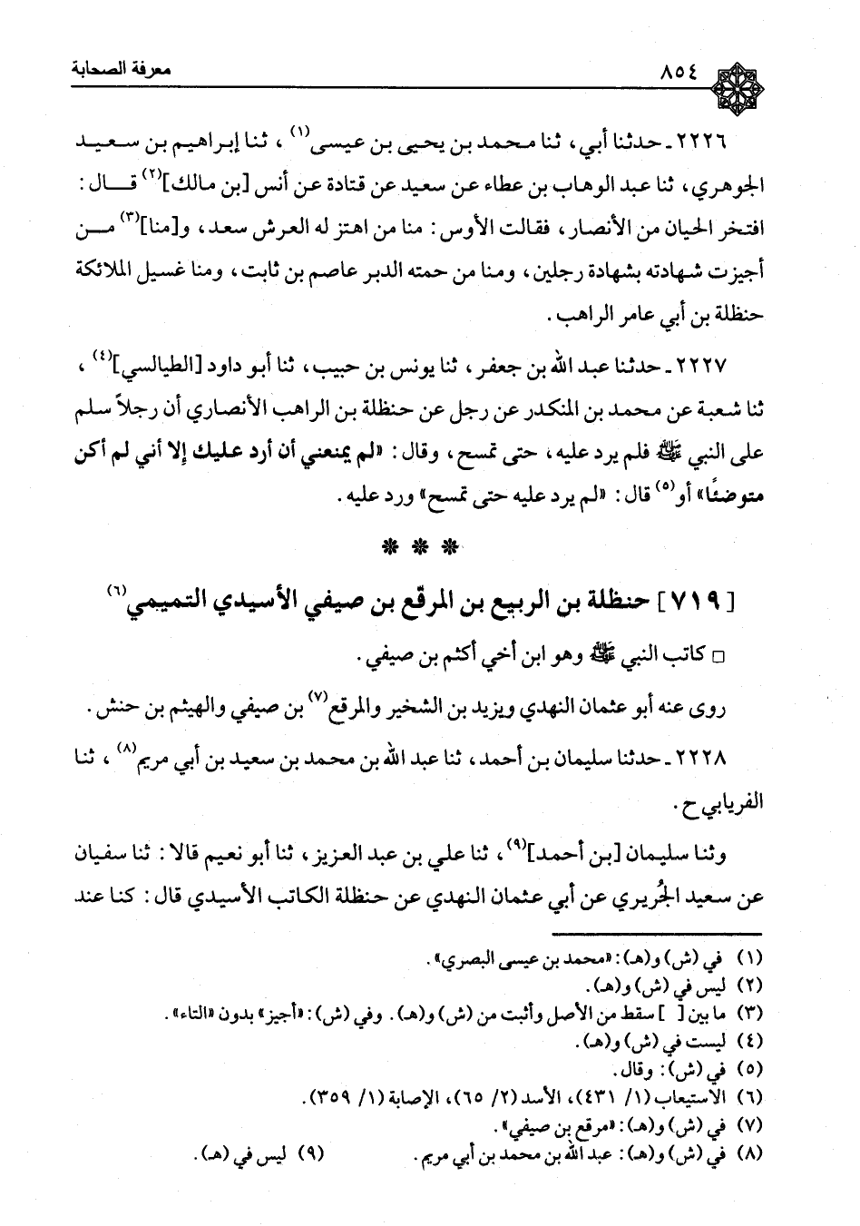 ٢٢٢٩ - حَدَّثَنَاهُ أَبُو عَمْرِو بْنُ حَمْدَانَ، ثنا الْحَسَنُ بْنُ سُفْيَانَ، ثنا الصَّلْتُ بْنُ مَسْعُودٍ، وَبِشْرُ بْنُ هِلَالٍ، قَالَا: ثنا جَعْفَرُ بْنُ سُلَيْمَانَ، ثنا الْجُرَيْرِيُّ، عَنْ أَبِي عُثْمَانَ، عَنْ حَنْظَلَةَ الْأُسَيِّدِيِّ، وَكَانَ مِنْ كُتَّابِ النَّبِيِّ صَلَّى اللَّهُ عَلَيْهِ وَسَلَّمَ قَالَ: أَتَيْتُ أَبَا بَكْرٍ، فَقُلْتُ: كَيْفَ أَنْتَ يَا أَبَا بَكْرٍ قَالَ: قُلْتُ: نَافَقَ حَنْظَلَةُ يَا أَبَا بَكْرٍ قَالَ: سُبْحَانَ اللهِ مَا تَقُولُ؟ قَالَ: قُلْتُ: نَافَقَ حَنْظَلَةُ يَا أَبَا بَكْرٍ قَالَ: وَمَا ذَاكَ؟ قَالَ: قُلْتُ: نَكُونُ عِنْدَ النَّبِيِّ صَلَّى اللَّهُ عَلَيْهِ وَسَلَّمَ يُذَكِّرُ بِالنَّارِ وَالْجَنَّةِ كَأَنَّا رَأْيُ عَيْنٍ، فَإِذَا خَرَجْنَا مِنْ عِنْدِهِ عَافَسْنَا الْأَزْوَاجَ وَالْأَوْلَادَ وَالضَّيْعَاتِ فَنَسِينَا كَثِيرًا، فَذَكَرَ الْحَدِيثَ مِثْلَهُ وَرَوَاهُ الثَّوْرِيُّ عَنْ سَلَمَةَ بْنِ كُهَيْلٍ، عَنِ الْهَيْثَمِ بْنِ حَنَشٍ، عَنْ حَنْظَلَةَ، نَحْوَهُ