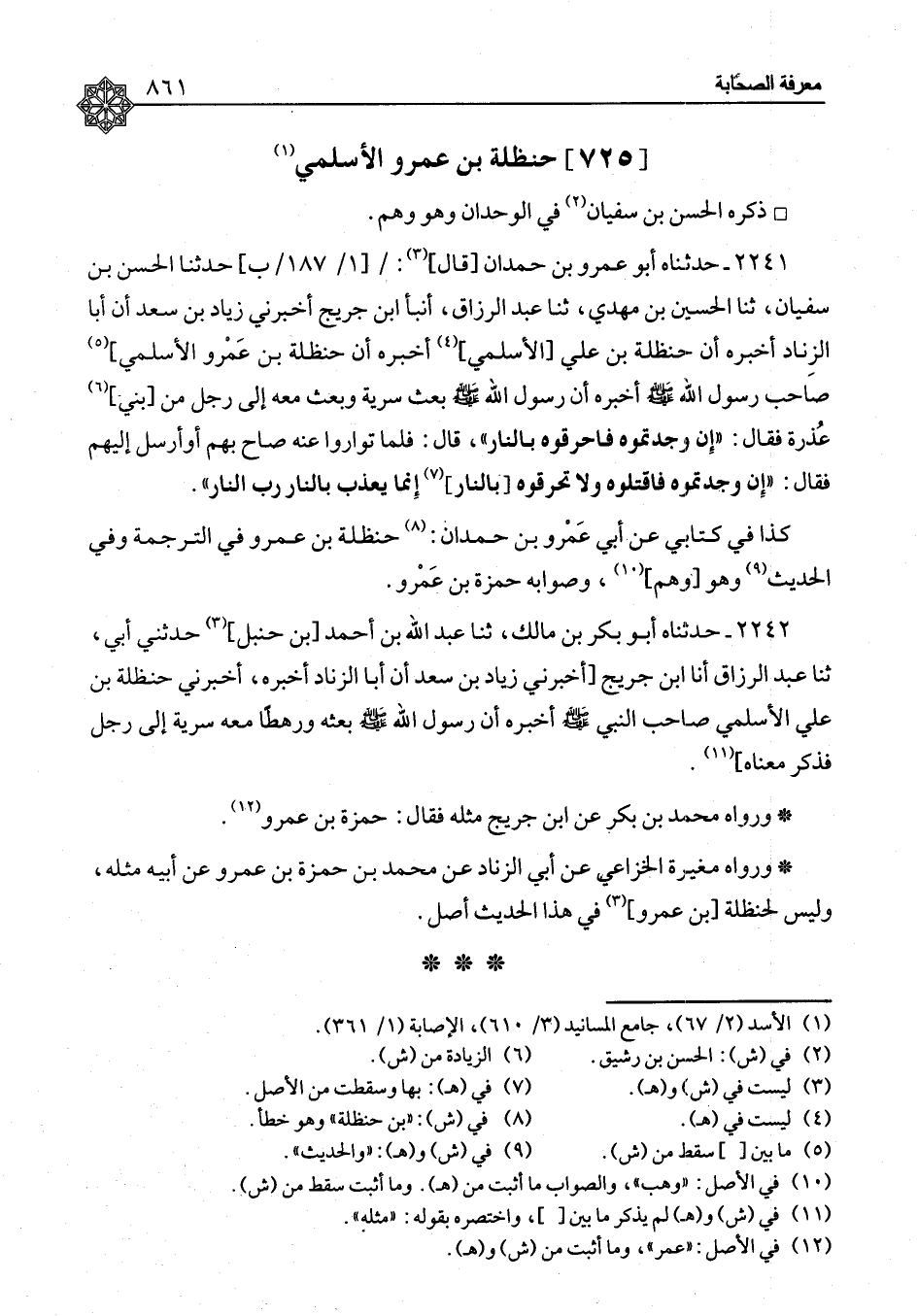 ٢٢٤١ - حَدَّثَنَاهُ أَبُو عَمْرِو بْنُ حَمْدَانَ، قَالَ: حَدَّثَنَا الْحَسَنُ بْنُ سُفْيَانَ، ثنا الْحُسَيْنُ بْنُ مَهْدِيٍّ، ثنا عَبْدُ الرَّزَّاقِ، أَنْبَأَ ابْنُ جُرِيحٍ، أَخْبَرَنِي زِيَادِ بْنِ سَعْدٍ أَنَّ أَبَا الزِّنَادِ، أَخْبَرَهُ، أَنَّ حَنْظَلَةَ بْنَ عَلِيٍّ الْأَسْلَمِيَّ، أَخْبَرَهُ، أَنَّ حَنْظَلَةَ بْنَ عَمْرٍو الْأَسْلَمِيَّ، صَاحِبَ رَسُولِ اللهِ صَلَّى اللَّهُ عَلَيْهِ وَسَلَّمَ أَخْبَرَهُ أَنَّ رَسُولَ اللهِ صَلَّى اللَّهُ عَلَيْهِ وَسَلَّمَ بَعَثَ سَرِيَّةً وَبَعَثَ مَعَهُ إِلَى رَجُلٍ مِنْ بَنِي عُذْرَةَ فَقَالَ: «إِنْ وَجَدْتُمُوهُ فَاحْرِقُوهُ بِالنَّارِ» قَالَ: فَلَمَّا تَوَارَوْا عَنْهُ صَاحَ بِهِمْ أَوْ أَرْسَلَ إِلَيْهِمْ فَقَالَ: «إِنْ وَجَدْتُمُوهُ فَاقْتُلُوهُ وَلَا تَحْرِقُوهُ بِالنَّارِ إِنَّمَا يُعَذِّبُ بِالنَّارِ رَبُّ النَّارِ» كَذَا فِي كِتَابِي عَنْ أَبِي عَمْرِو بْنِ حَمْدَانَ حَنْظَلَةَ بْنِ عَمْرٍو فِي التَّرْجَمَةِ وَفِي الْحَدِيثِ وَهُوَ وَهْمٌ، وَصَوَابُهُ حَمْزَةُ بْنُ عَمْرٍو
