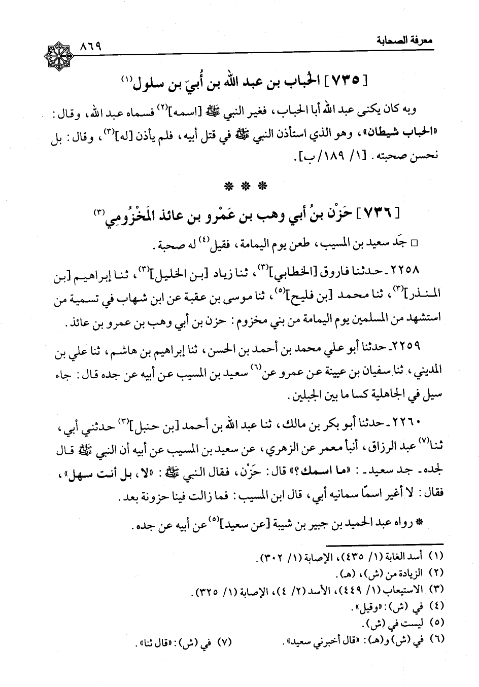 ٢٢٦٠ - حَدَّثَنَا أَبُو بَكْرِ بْنُ مَالِكٍ، ثنا عَبْدُ اللهِ بْنُ أَحْمَدَ بْنِ حَنْبَلٍ، حَدَّثَنِي أَبِي، ثنا عَبْدُ الرَّزَّاقِ، أَنْبَأَ مَعْمَرٌ، عَنِ الزُّهْرِيِّ، عَنْ سَعِيدِ بْنِ الْمُسَيِّبِ، عَنْ أَبِيهِ، أَنَّ النَّبِيَّ صَلَّى اللَّهُ عَلَيْهِ وَسَلَّمَ قَالَ لِجَدِّهِ جَدِّ سَعِيدٍ: «مَا اسْمُكَ؟» قَالَ: حَزَنٌ، فَقَالَ النَّبِيُّ صَلَّى اللَّهُ عَلَيْهِ وَسَلَّمَ: «لَا، بَلْ أَنْتَ سَهْلٌ» ، فَقَالَ: لَا أُغَيِّرُ اسْمًا سَمَّانِيهِ أَبِي. قَالَ ابْنُ الْمُسَيِّبِ: فَمَا زَالَتْ فِينَا حَزُونَةٌ بَعْدُ " رَوَاهُ عَبْدُ الْحَمِيدِ بْنُ جُبَيْرِ بْنِ شَيْبَةَ، عَنْ سَعِيدٍ، عَنْ أَبِيهِ، عَنْ جَدِّهِ