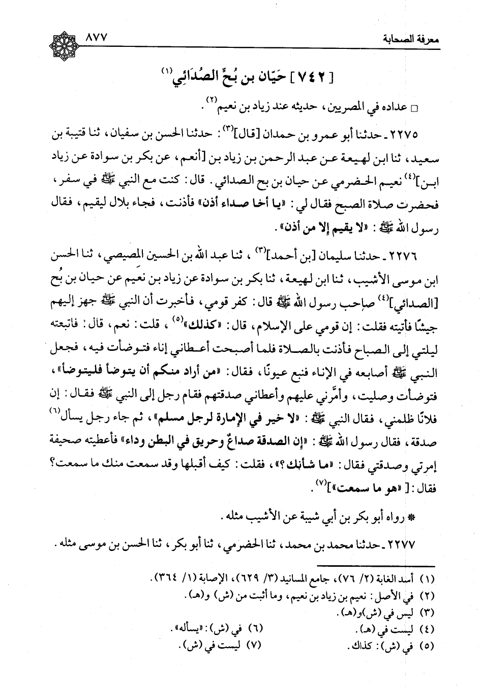 ٢٢٧٦ - حَدَّثَنَا سُلَيْمَانُ بْنُ أَحْمَدَ، ثنا عَبْدُ اللهِ بْنُ الْحُسَيْنِ الْمِصِّيصِيُّ، ثنا الْحَسَنُ بْنُ مُوسَى الْأَشْيَبُ، ثنا ابْنُ لَهِيعَةَ، ثنا بَكْرُ بْنُ سَوَادَةَ، عَنْ زِيَادِ بْنِ نُعَيْمٍ، عَنْ حَيَّانَ بْنِ بُحٍّ الصُّدَائِيِّ، صَاحِبِ رَسُولِ اللهِ صَلَّى اللَّهُ عَلَيْهِ وَسَلَّمَ قَالَ: كَفَرَ قَوْمِي، فَأُخْبِرْتُ أَنَّ النَّبِيَّ صَلَّى اللَّهُ عَلَيْهِ وَسَلَّمَ جَهَّزَ إِلَيْهِمْ جَيْشًا، فَأَتَيْتُهُ فَقُلْتُ: إِنَّ قَوْمِي عَلَى الْإِسْلَامِ قَالَ: «كَذَلِكَ» ، قُلْتُ: نَعَمْ قَالَ: فَاتَّبَعْتُهُ لَيْلَتِي إِلَى الصَّبَّاحِ فَأَذَّنْتُ بِالصَّلَاةِ فَلَمَّا أَصْبَحْتُ أَعْطَانِي إِنَاءً فَتَوَضَّأْتُ فِيهِ، فَجَعَلَ النَّبِيُّ صَلَّى اللَّهُ عَلَيْهِ وَسَلَّمَ أَصَابِعَهُ فِي الْإِنَاءِ فَنَبَعَ عُيُونًا، فَقَالَ: «مَنْ أَرَادَ مِنْكُمْ أَنْ يَتَوَضَّأَ فَلْيَتَوَضَّأْ» ، فَتَوَضَّأْتُ وَصَلَّيْتُ، وَأَمَّرَنِي عَلَيْهِمْ وَأَعْطَانِي صَدَقَتَهُمْ فَقَامَ رَجُلٌ إِلَى النَّبِيِّ صَلَّى اللَّهُ عَلَيْهِ وَسَلَّمَ فَقَالَ: إِنَّ فُلَانًا ظَلَمَنِي، فَقَالَ النَّبِيُّ صَلَّى اللَّهُ عَلَيْهِ وَسَلَّمَ: «لَا خَيْرَ فِي الْإِمَارَةِ لِرَجُلٍ مُسْلِمٍ» ، ثُمَّ جَاءَ رَجُلٌ يَسْأَلُ صَدَقَةً، فَقَالَ رَسُولُ اللهِ صَلَّى اللَّهُ عَلَيْهِ وَسَلَّمَ: «إِنَّ الصَّدَقَةَ صُدَاعٌ وَحَرِيقٌ فِي الْبَطْنِ وَدَاءٌ» فَأَعْطَيْتُهُ صَحِيفَةَ إِمْرَتِي وَصَدَقَتِي فَقَالَ: «مَا شَأْنُكَ؟» ، فَقُلْتُ: كَيْفَ أَقَبَلُهَا وَقَدْ سَمِعْتُ مِنْكَ مَا سَمِعْتُ؟ فَقَالَ: «هُوَ مَا سَمِعْتَ» رَوَاهُ أَبُو بَكْرِ بْنُ أَبِي شَيْبَةَ، عَنِ الْأَشْيَبِ، مِثْلَهُ