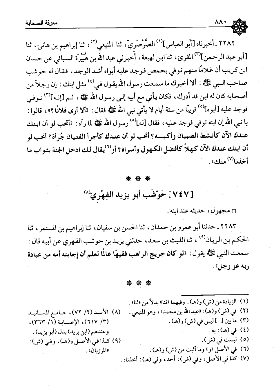 ٢٢٨٢ - أَخْبَرَنَاهُ أَبُو الْعَبَّاسِ الصَّرْصَرِيُّ، ثنا الْمَنِيعِيُّ، ثنا إِبْرَاهِيمُ بْنُ هَانِئٍ، ثنا أَبُو عَبْدِ الرَّحْمَنِ الْمُقْرِئُ، ثنا ابْنُ لَهِيعَةَ، أَخْبَرَنِي عَبْدُ اللهِ بْنُ هُبَيْرَةَ السَّبَائِيُّ، عَنْ حَسَّانَ بْنِ كُرَيْبٍ، أَنَّ غُلَامًا، مِنْهُمْ تُوُفِّيَ بِحِمْصَ فَوَجَدَ عَلَيْهِ أَبَوَاهُ أَشَدَّ الْوَجْدِ، فَقَالَ لَهُ حَوْشَبٌ صَاحِبُ النَّبِيِّ صَلَّى اللَّهُ عَلَيْهِ وَسَلَّمَ: أَلَا أُخْبِرُكَ مَا سَمِعْتُ رَسُولَ اللهِ يَقُولُ فِي مِثْلِ ابْنِكَ: إِنَّ رَجُلًا مِنْ أَصْحَابِهِ كَانَ لَهُ ابْنٌ قَدْ أَدْرَكَ، فَكَانَ يَأْتِي مَعَ أَبِيهِ إِلَى رَسُولِ اللهِ صَلَّى اللَّهُ عَلَيْهِ وَسَلَّمَ، ثُمَّ إِنَّهُ تُوُفِّيَ فَوَجَدَ عَلَيْهِ أَبُوهُ قَرِيبًا مِنْ سِتَّةِ أَيَّامٍ لَا يَأْتِي نَبِيَّ اللهِ صَلَّى اللَّهُ عَلَيْهِ وَسَلَّمَ فَقَالَ: «أَلَا أَرَى فُلَانًا؟» قَالُوا: يَا نَبِيَّ اللهِ إِنَّ ابْنَهُ تُوُفِّيَ فَوَجَدَ عَلَيْهِ، فَقَالَ لَهُ رَسُولُ اللهِ صَلَّى اللَّهُ عَلَيْهِ وَسَلَّمَ لَمَّا رَآهُ: " أَتُحِبُّ لَوْ أَنَّ ابْنَكَ عِنْدَكَ الْآنَ كَأَنْشَطِ الصِّبْيَانِ وَأَكْيَسِهِ؟ أَتُحِبُّ لَوْ أَنَّ عِنْدَكَ كَأَجْرَأِ الْفِتْيَانِ جُرْأَةً؟ أَتُحِبُّ لَوْ أَنَّ ابْنَكَ عِنْدَكَ الْآنَ كَهْلًا كَأَفْضَلِ الْكُهُولِ وَأَسْرَاهُ أَوْ يُقَالُ لَكَ: ادْخُلِ الْجَنَّةَ بِثَوَابِ مَا أَخَذْنَا مِنْكَ "