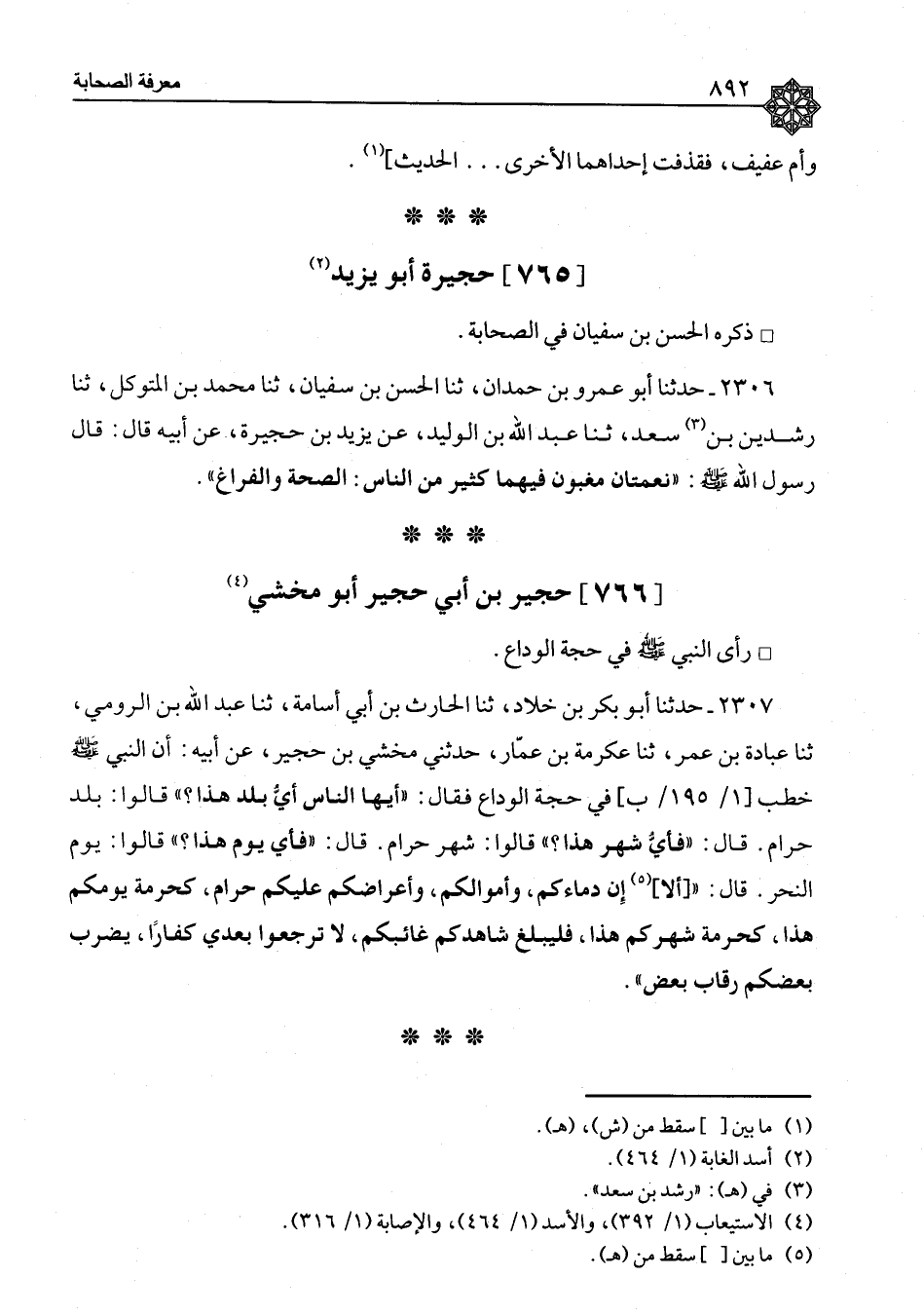 ٢٣٠٧ - حَدَّثَنَا أَبُو بَكْرِ بْنُ خَلَّادٍ، ثنا الْحَارِثُ بْنُ أَبِي أُسَامَةَ، ثنا عَبْدُ اللهِ بْنُ الرُّومِيِّ، ثنا عُبَادَةُ بْنُ عُمَرَ، ثنا عِكْرِمَةُ بْنُ عَمَّارٍ، حَدَّثَنِي مَخْشِيُّ بْنُ حُجَيْرٍ، عَنْ أَبِيهِ: أَنَّ النَّبِيَّ صَلَّى اللَّهُ عَلَيْهِ وَسَلَّمَ خَطَبَ فِي حَجَّةِ الْوَدَاعِ فَقَالَ: «أَيُّهَا النَّاسُ أَيُّ بَلَدٍ هَذَا؟» قَالُوا: بَلَدٌ حَرَامٌ , قَالَ: «فَأَيُّ شَهْرٍ هَذَا؟» قَالُوا: شَهْرٌ حَرَامٌ , قَالَ: «فَأَيُّ يَوْمٍ هَذَا؟» قَالُوا: يَوْمُ النَّحْرِ , قَالَ: «أَلَا إِنَّ دِمَاءَكُمْ، وَأَمْوَالَكُمْ، وَأَعْرَاضَكُمْ عَلَيْكُمْ حَرَامٌ كَحُرِمَةِ يَوْمِكُمْ هَذَا، كَحُرْمَةِ شَهْرِكُمْ هَذَا، فَلْيُبَلِّغْ شَاهِدُكُمْ غَائِبَكُمْ، لَا تَرْجِعُوا بَعْدِي كُفَّارًا، يَضْرِبُ بَعْضُكُمْ رِقَابَ بَعْضٍ»