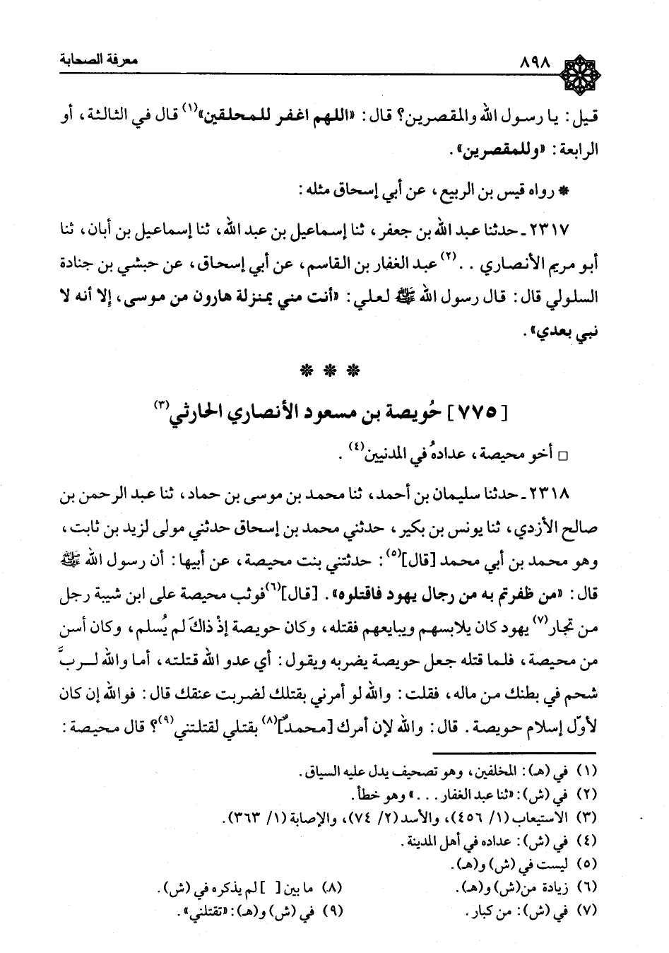 ٢٣١٨ - حَدَّثَنَا سُلَيْمَانُ بْنُ أَحْمَدَ، ثنا مُحَمَّدُ بْنُ مُوسَى بْنِ حَمَّادٍ، ثنا عَبْدُ الرَّحْمَنِ بْنُ صَالِحٍ الْأَزْدِيُّ، ثنا يُونُسُ بْنُ بُكَيْرٍ، حَدَّثَنِي مُحَمَّدُ بْنُ إِسْحَاقَ، حَدَّثَنِي مَوْلًى لِزَيْدِ بْنِ ثَابِتٍ وَهُوَ مُحَمَّدُ بْنُ أَبِي مُحَمَّدٍ قَالَ: حَدَّثَتْنِي بِنْتُ مُحَيِّصَةَ، عَنْ أَبِيهَا: أَنَّ رَسُولَ اللهِ صَلَّى اللَّهُ عَلَيْهِ وَسَلَّمَ قَالَ: «مَنْ ظَفَرْتُمْ بِهِ مِنْ رِجَالِ يَهُودَ فَاقْتُلُوهُ» قَالَ فَوَثَبَ مُحَيِّصَةُ عَلَى ابْنِ شَيْبَةَ رَجُلٍ مِنْ تُجَّارِ يَهُودَ كَانَ يُلَابِسُهُمْ وَيُبَايِعُهُمْ فَقَتَلَهُ، وَكَانَ حُوَيِّصَةُ إِذْ ذَاكَ لَمْ يُسْلِمْ، وَكَانَ أَسَنَّ مِنْ مُحَيِّصَةَ، فَلَمَّا قَتَلَهُ جَعَلَ حُوَيِّصَةُ يَضْرِبُهُ وَيَقُولُ: أَيْ عَدُوَّ اللهِ , قَتَلْتَهُ، أَمَا وَاللهِ لَرُبَّ شَحْمٍ فِي بَطْنِكَ مِنْ مَالِهِ، فَقُلْتُ: وَاللهِ لَوْ أَمَرَنِي بِقَتْلِكَ لَضَرَبْتُ عُنُقَكَ قَالَ: فَوَاللهِ إِنْ كَانَ لَأَوَّلُ إِسْلَامِ حُوَيِّصَةَ قَالَ: وَاللهِ لَإِنْ أَمَرَكَ مُحَمَّدٌ بِقَتْلِي لَقَتَلْتَنِي؟ قَالَ مُحَيِّصَةُ: ⦗٨٩٩⦘ نَعَمْ وَاللهِ قَالَ حُوَيِّصَةُ: فَوَاللهِ إِنَّ دِينًا بَلَغَ بِكَ هَذَا إِنَّهُ لَعَجَبٌ "