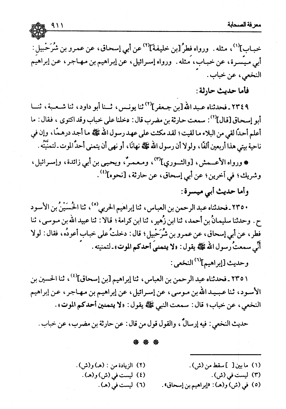 ٢٣٤٩ - فَحَدَّثَنَاهُ عَبْدُ اللهِ بْنُ جَعْفَرٍ، ثنا يُونُسُ، ثنا أَبُو دَاوُدَ، ثنا شُعْبَةُ، ثنا أَبُو إِسْحَاقَ، قَالَ: سَمِعْتُ حَارِثَةَ بْنَ مُضَرِّبٍ، قَالَ: " دَخَلْنَا عَلَى خَبَّابٍ وَقَدِ اكْتَوَى، فَقَالَ: مَا أَعْلَمُ أَحَدًا لَقِيَ مِنَ الْبَلَاءِ مَا لَقِيتُ، لَقَدْ مَكَثْتُ عَلَى عَهْدِ رَسُولِ اللهِ صَلَّى اللَّهُ عَلَيْهِ وَسَلَّمَ مَا أَجِدُ دِرْهَمًا، وَإِنَّ فِي نَاحِيَةِ بَيْتِي هَذَا أَرْبَعِينَ أَلْفًا، وَلَوْلَا أَنَّ رَسُولَ اللهِ صَلَّى اللَّهُ عَلَيْهِ وَسَلَّمَ نَهَانَا، أَوْ نَهَى أَنْ يَتَمَنَّى أَحَدٌ الْمَوْتَ لَتَمَنَّيْتُهُ " وَرَوَاهُ الْأَعْمَشُ، وَالثَّوْرِيُّ، وَمَعْمَرٌ، وَيَحْيَى بْنُ أَبِي زَائِدَةَ، وَإِسْرَائِيلُ، وَشَرِيكٌ، فِي آخَرِينَ، عَنْ أَبِي إِسْحَاقَ، عَنْ حَارِثَةَ، نَحْوَهُ
