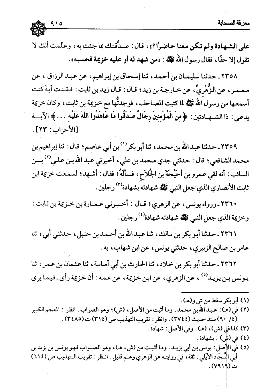 ٢٣٥٨ - حَدَّثَنَا سُلَيْمَانُ بْنُ أَحْمَدَ، ثنا إِسْحَاقُ بْنُ إِبْرَاهِيمَ، عَنْ عَبْدِ الرَّزَّاقِ، عَنْ مَعْمَرٍ، عَنِ الزُّهْرِيِّ، عَنْ خَارِجَةَ بْنِ زَيْدٍ، قَالَ: قَالَ زَيْدُ بْنُ ثَابِتٍ: " فَقَدْتُ آيَةً كُنْتُ أَسْمَعُهَا مِنْ رَسُولِ اللهِ صَلَّى اللَّهُ عَلَيْهِ وَسَلَّمَ لَمَّا كَتَبْتُ الْمَصَاحِفَ، فَوَجَدْتُهَا مَعَ خُزَيْمَةَ بْنِ ثَابِتٍ، وَكَانَ خُزَيْمَةُ يُدْعَى ذَا الشَّهَادَتَيْنِ {مِنَ الْمُؤْمِنِينَ رِجَالٌ صَدَقُوا مَا عَاهَدُوا اللهَ عَلَيْهِ} [الأحزاب: ٢٣] الْآيَةَ "