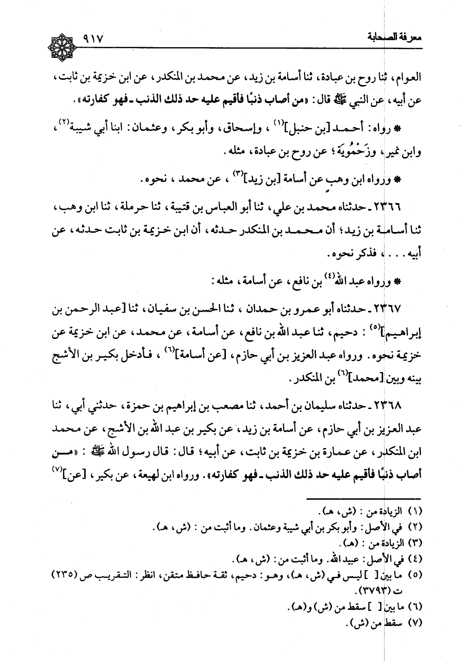 ٢٣٦٨ - حَدَّثَنَاهُ سُلَيْمَانُ بْنُ أَحْمَدَ، ثنا مُصْعَبُ بْنُ إِبْرَاهِيمَ بْنِ حَمْزَةَ، حَدَّثَنِي أَبِي، ثنا عَبْدُ الْعَزِيزِ بْنُ أَبِي حَازِمٍ، عَنْ أُسَامَةَ بْنِ زَيْدٍ، عَنْ بُكَيْرِ بْنِ عَبْدِ اللهِ بْنِ الْأَشَجِّ، عَنْ مُحَمَّدِ بْنِ الْمُنْكَدِرِ، عَنْ عُمَارَةَ بْنِ خُزَيْمَةَ بْنِ ثَابِتٍ، عَنْ أَبِيهِ، قَالَ: قَالَ رَسُولُ اللهِ صَلَّى اللَّهُ عَلَيْهِ وَسَلَّمَ: «مَنْ أَصَابَ ذَنْبًا فَأُقِيمَ عَلَيْهِ حَدُّ ذَلِكَ الذَّنْبِ فَهُوَ كَفَّارَتُهُ» وَرَوَاهُ ابْنُ لَهِيعَةَ، عَنْ بُكَيْرٍ، عَنِ ⦗٩١٨⦘ ابْنِ الْمُنْكَدِرِ، نَحْوَهُ