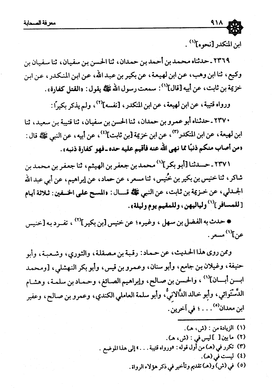 ٢٣٦٩ - حَدَّثَنَاهُ مُحَمَّدُ بْنُ أَحْمَدَ بْنِ حَمْدَانَ، ثنا الْحَسَنُ بْنُ سُفْيَانَ , ثنا سُفْيَانُ بْنُ وَكِيعٍ، ثنا ابْنُ وَهْبٍ، عَنِ ابْنِ لَهِيعَةَ، عَنْ بُكَيْرِ بْنِ عَبْدِ اللهِ، عَنِ ابْنِ الْمُنْكَدِرِ، عَنِ ابْنِ خُزَيْمَةَ بْنِ ثَابِتٍ، عَنْ أَبِيهِ، قَالَ: سَمِعْتُ، رَسُولَ اللهِ صَلَّى اللَّهُ عَلَيْهِ وَسَلَّمَ يَقُولُ: «الْقَتْلُ كَفَّارَةٌ» وَرَوَاهُ قُتَيْبَةُ، عَنِ ابْنِ لَهِيعَةَ، عَنِ ابْنِ الْمُنْكَدِرِ، نَفْسَهُ، وَلَمْ يَذْكُرْ بُكَيْرًا