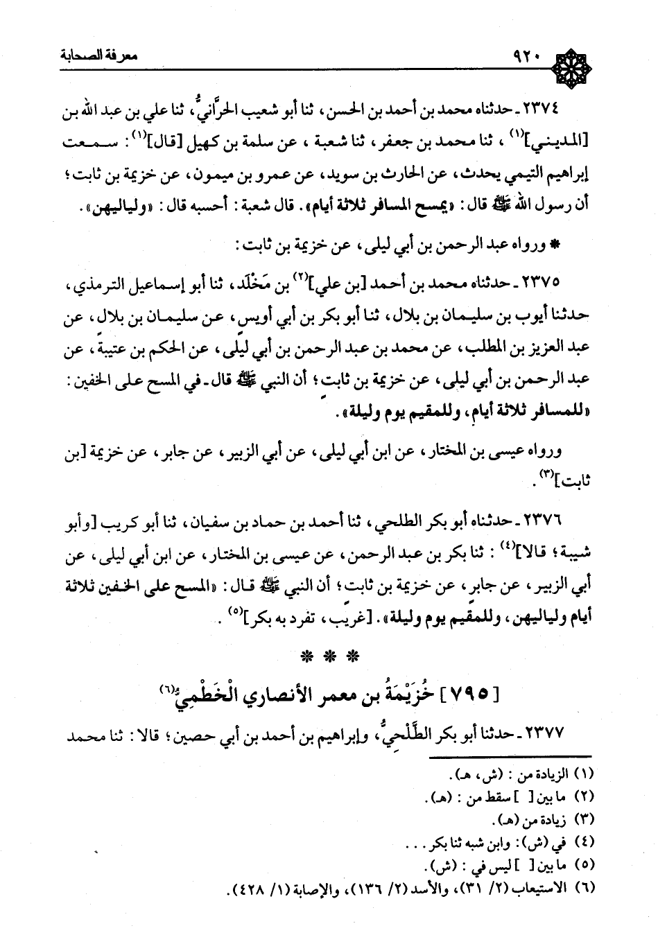 ٢٣٧٤ - حَدَّثَنَاهُ مُحَمَّدُ بْنُ أَحْمَدَ بْنِ الْحَسَنِ، ثنا أَبُو شُعَيْبٍ الْحَرَّانِيُّ، ثنا عَلِيُّ بْنُ عَبْدِ اللهِ بْنِ الْمَدِينِيِّ، ثنا مُحَمَّدُ بْنُ جَعْفَرٍ، ثنا شُعْبَةُ، عَنْ سَلَمَةَ بْنِ كُهَيْلٍ، قَالَ: سَمِعْتُ إِبْرَاهِيمَ التَّيْمِيَّ، يُحَدِّثُ عَنِ الْحَارِثِ بْنِ سُوَيْدٍ، عَنْ عَمْرِو بْنِ مَيْمُونٍ، عَنْ خُزَيْمَةَ بْنِ ثَابِتٍ، أَنَّ رَسُولَ اللهِ صَلَّى اللَّهُ عَلَيْهِ وَسَلَّمَ قَالَ: «يَمْسَحُ الْمُسَافِرُ ثَلَاثَةَ أَيَّامٍ» قَالَ شُعْبَةُ: أَحْسَبُهُ قَالَ: «وَلَيَالِيهِنَّ» رَوَاهُ عَبْدُ الرَّحْمَنِ بْنُ أَبِي لَيْلَى، عَنْ خُزَيْمَةَ بْنِ ثَابِتٍ