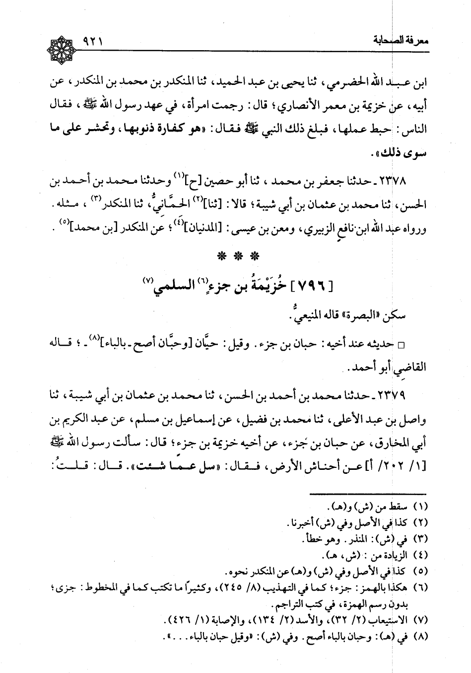 خُزَيْمَةُ بْنُ جَزْءٍ السُّلَمِيُّ سَكَنَ الْبَصْرَةَ قَالَهُ الْمَنِيعِيُّ، حَدِيثُهُ عِنْدَ أَخِيهِ حَبَّانَ بْنِ جَزْءٍ وَقِيلَ: حَيَّانُ، وَحَبَّانُ أَصَحُّ بِالْبَاءِ، قَالَهُ الْقَاضِي أَبُو أَحْمَدَ