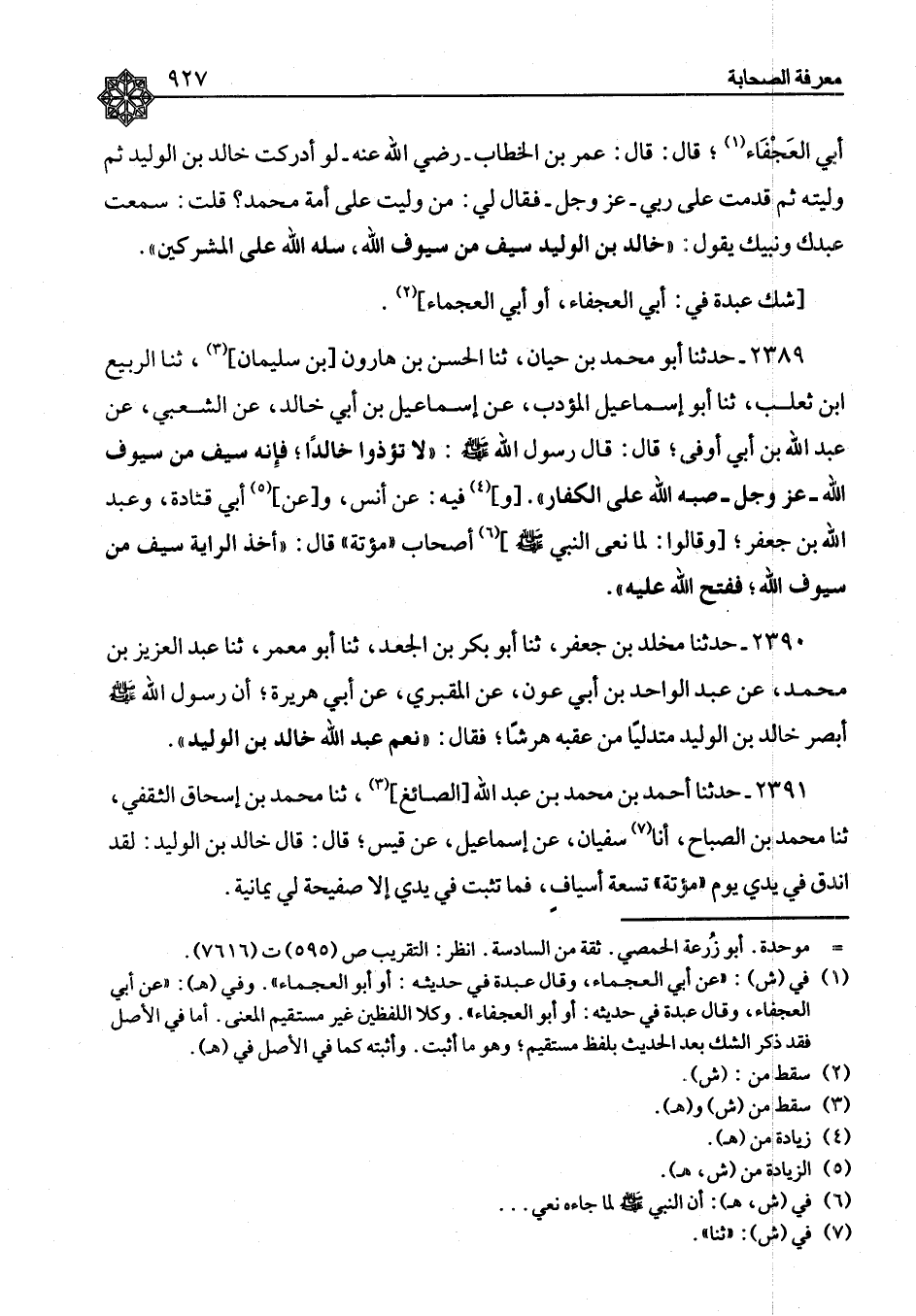 ٢٣٩١ - حَدَّثَنَا أَحْمَدُ بْنُ مُحَمَّدِ بْنِ عَبْدِ اللهِ الصَّائِغُ، ثنا مُحَمَّدُ بْنُ إِسْحَاقَ الثَّقَفِيُّ، ثنا مُحَمَّدُ بْنُ الصَّبَاحِ، أنا سُفْيَانُ، عَنْ إِسْمَاعِيلَ، عَنْ قَيْسٍ، قَالَ: قَالَ خَالِدُ بْنُ الْوَلِيدِ: «لَقَدِ انْدَقَّ فِي يَدِي يَوْمَ مُؤْتَةَ تِسْعَةُ أَسْيَافٍ، فَمَا تَثْبُتُ فِي يَدِي إِلَّا صَحِيفَةٌ لِي يَمَانِيَةٌ» ⦗٩٢٨⦘ رَوَاهُ زَائِدَةُ، عَنْ إِسْمَاعِيلَ، وَقَالَ: قَالَ خَالِدٌ يَوْمَ الْحِيرَةِ
