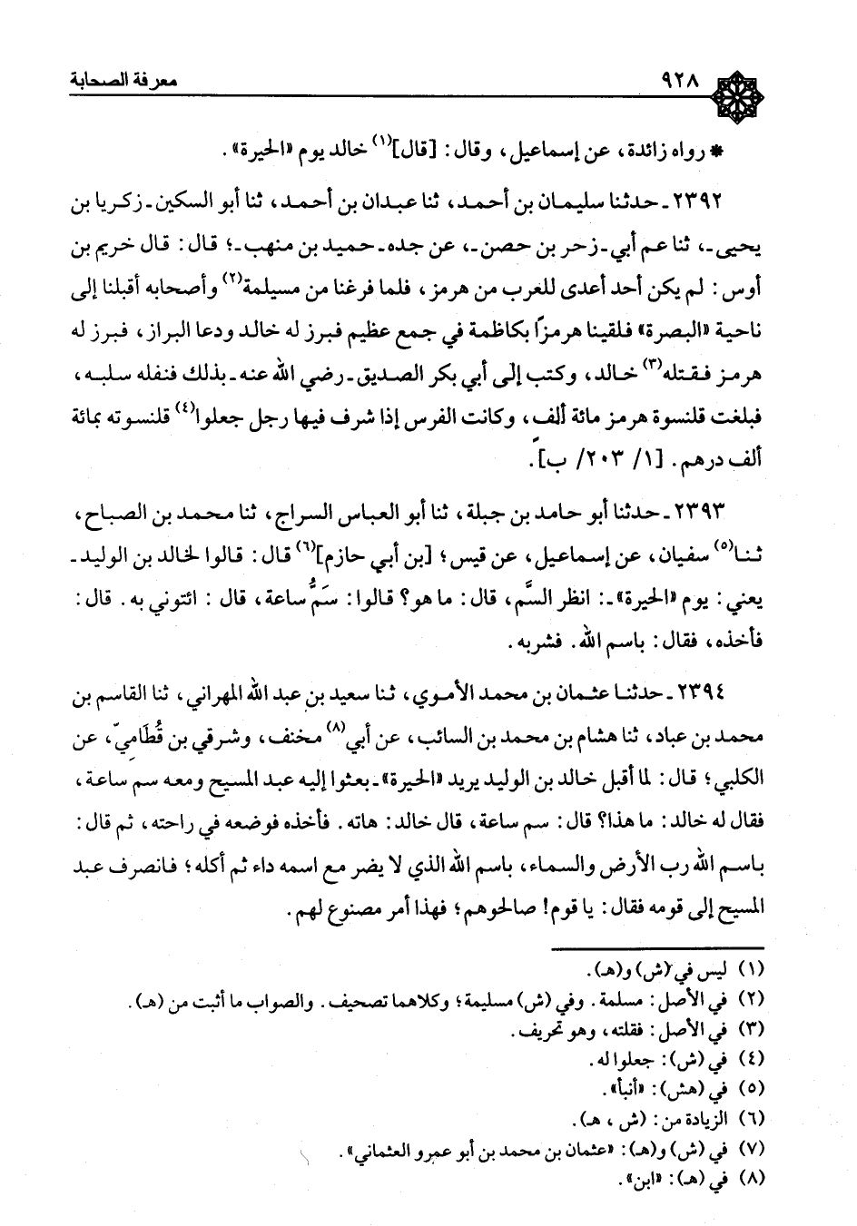 ٢٣٩٣ - حَدَّثَنَا أَبُو حَامِدِ بْنُ جَبَلَةَ، ثنا أَبُو الْعَبَّاسِ السَّرَّاجُ، ثنا مُحَمَّدُ بْنُ الصَّبَّاحِ، ثنا سُفْيَانُ، عَنْ إِسْمَاعِيلَ، عَنْ قَيْسِ بْنِ أَبِي حَازِمٍ، قَالَ: " قَالُوا لِخَالِدِ بْنِ الْوَلِيدِ يَعْنِي يَوْمَ الْحِيرَةِ: انْظُرِ السَّمَّ قَالَ: مَا هُوَ؟ قَالُوا: سَمُّ سَاعَةٍ , قَالَ: ائْتُونِي بِهِ , قَالَ: فَأَخَذَهُ، فَقَالَ: بِاسْمِ اللهِ، فَشَرِبَهُ "