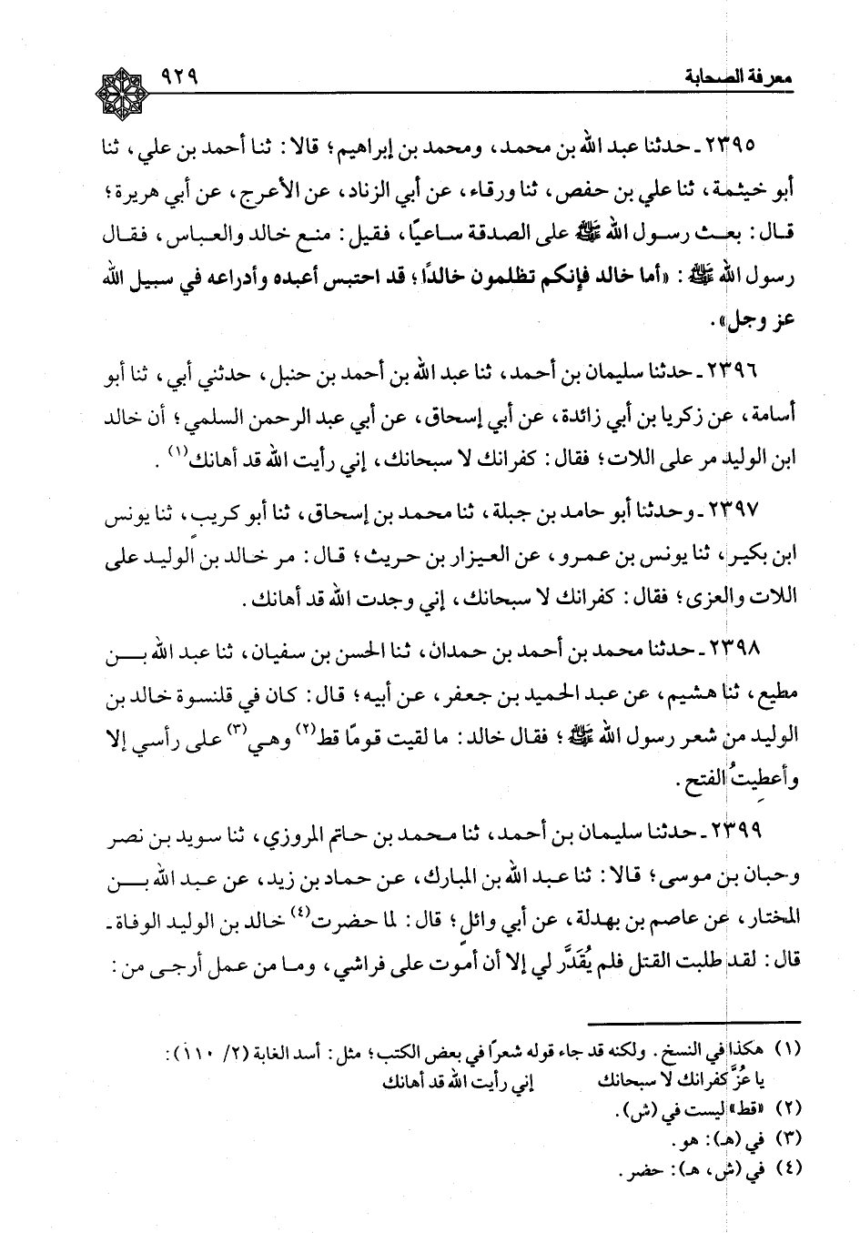 ٢٣٩٦ - حَدَّثَنَا سُلَيْمَانُ بْنُ أَحْمَدَ، ثنا عَبْدُ اللهِ بْنُ أَحْمَدَ بْنِ حَنْبَلٍ، حَدَّثَنِي أَبِي، ثنا أَبُو أُسَامَةَ، عَنْ زَكَرِيَّا بْنِ أَبِي زَائِدَةَ، عَنْ أَبِي إِسْحَاقَ، عَنْ أَبِي عَبْدِ الرَّحْمَنِ السُّلَمِيِّ، " أَنَّ خَالِدَ بْنَ الْوَلِيدِ مَرَّ عَلَى اللَّاتِ فَقَالَ: كُفْرَانَكِ، لَا سُبْحَانَكِ، إِنِّي رَأَيْتُ اللهَ قَدْ أَهَانَكَ "