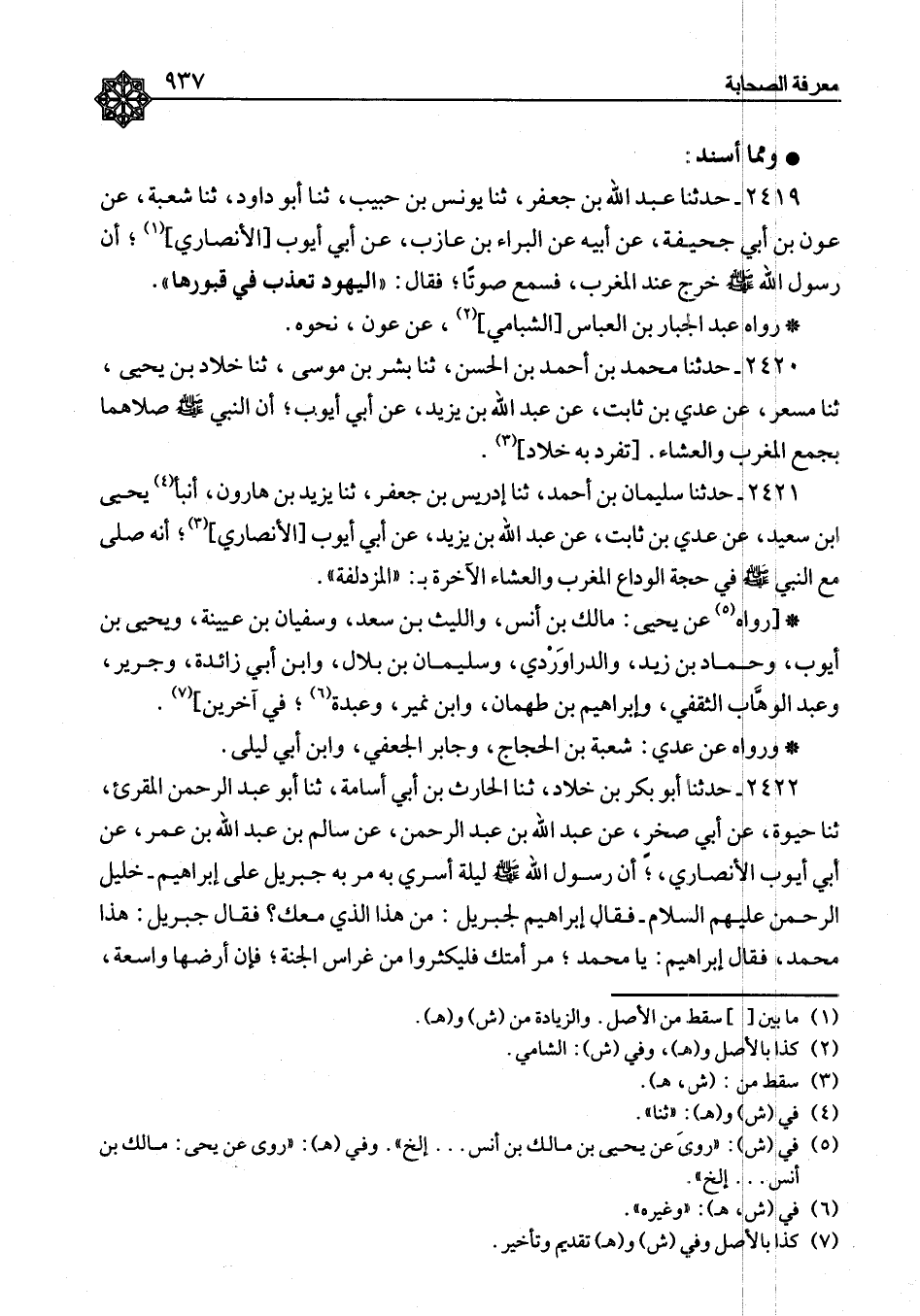 ٢٤٢١ - حَدَّثَنَا سُلَيْمَانُ بْنُ أَحْمَدَ، ثنا إِدْرِيسُ بْنُ جَعْفَرٍ، ثنا يَزِيدُ بْنُ هَارُونَ، أَنْبَأَ يَحْيَى بْنُ سَعِيدٍ، عَنْ عَدِيِّ بْنِ ثَابِتٍ، عَنْ عَبْدِ اللهِ بْنِ يَزِيدَ، عَنْ أَبِي أَيُّوبَ الْأَنْصَارِيِّ، «أَنَّهُ صَلَّى مَعَ النَّبِيِّ صَلَّى اللَّهُ عَلَيْهِ وَسَلَّمَ فِي حَجَّةِ الْوَدَاعِ الْمَغْرِبَ وَالْعِشَاءَ الْآخِرَةَ بِالْمُزْدَلِفَةِ» رَوَاهُ عَنْ يَحْيَى: مَالِكُ بْنُ أَنَسٍ، وَاللَّيْثُ بْنُ سَعْدٍ، وَسُفْيَانُ بْنُ عُيَيْنَةَ، وَيَحْيَى بْنُ أَيُّوبَ، وَحَمَّادُ بْنُ زَيْدٍ، وَالدَّرَاوَرْدِيُّ، وَسُلَيْمَانُ بْنُ بِلَالٍ، وَابْنُ أَبِي زَائِدَةَ، وَجَرِيرٌ، وَعَبْدُ الْوَهَّابِ الثَّقَفِيُّ، وَإِبْرَاهِيمُ بْنُ طَهْمَانَ، وَابْنُ نُمَيْرٍ، وَعَبْدَةُ، فِي آخَرِينَ وَرَوَاهُ عَنْ عَدِيٍّ: شُعْبَةُ بْنُ الْحَجَّاجِ، وَجَابِرٌ الْجُعْفِيُّ، وَابْنُ أَبِي لَيْلَى