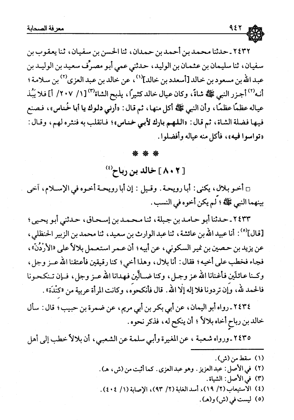 ٢٤٣٢ - حَدَّثَنَا مُحَمَّدُ بْنُ أَحْمَدَ بْنِ حَمْدَانَ، ثنا الْحَسَنُ بْنُ سُفْيَانَ، ثنا يَعْقُوبُ بْنُ سُفْيَانَ، ثنا سُفْيَانُ بْنُ عُثْمَانَ بْنِ الْوَلِيدِ، حَدَّثَنِي عَمِّي أَبُو مُصَرِّفٍ سَعِيدُ بْنُ الْوَلِيدِ بْنِ عَبْدِ اللهِ بْنِ مَسْعُودِ بْنِ خَالِدٍ، عَنْ خَالِدِ بْنِ عَبْدِ الْعُزَّى بْنِ سَلَامَةَ، أَنَّهُ أَجْزَرَ النَّبِيَّ صَلَّى اللَّهُ عَلَيْهِ وَسَلَّمَ شَاةً، وَكَانَ عِيَالُ خَالِدٍ كَثِيرًا يَذْبَحُ الشَّاةَ فَلَا يَبُذُّ عِيَالَهُ عَظْمًا عَظْمًا، وَأَنَّ النَّبِيَّ صَلَّى اللَّهُ عَلَيْهِ وَسَلَّمَ أَكَلَ مِنْهَا، ثُمَّ قَالَ: «أَرِنِي دَلْوَكَ يَا أَبَا خُنَاسٍ» ، فَصَنَعَ فِيهَا فَضْلَةَ الشَّاةِ، ثُمَّ قَالَ: «اللهُمَّ بَارِكْ لِأَبِي خُنَاسٍ» ، فَانْقَلَبَ بِهِ فَنَثَرَهُ لَهُمْ، وَقَالَ: «تَوَاسَوْا فِيهِ» ، فَأَكَلَ مِنْهُ عِيَالُهُ وَأَفْضَلُوا "
