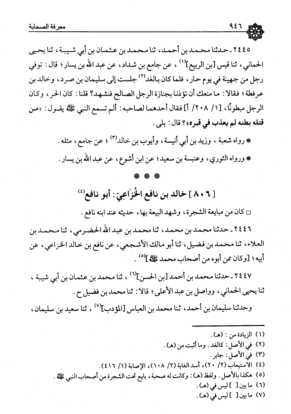 ٢٤٤٦ - حَدَّثَنَا مُحَمَّدُ بْنُ مُحَمَّدٍ، ثنا مُحَمَّدُ بْنُ عَبْدِ اللهِ الْحَضْرَمِيُّ، ثنا مُحَمَّدُ بْنُ الْعَلَاءِ، ثنا مُحَمَّدُ بْنُ فُضَيْلٍ، ثنا أَبُو مَالِكٍ الْأَشْجَعِيُّ، عَنْ نَافِعِ بْنِ خَالِدٍ الْخُزَاعِيِّ، عَنْ أَبِيهِ، وَكَانَ مِمَّنْ أَبُوهُ مِنْ أَصْحَابِ مُحَمَّدٍ صَلَّى اللَّهُ عَلَيْهِ وَسَلَّمَ