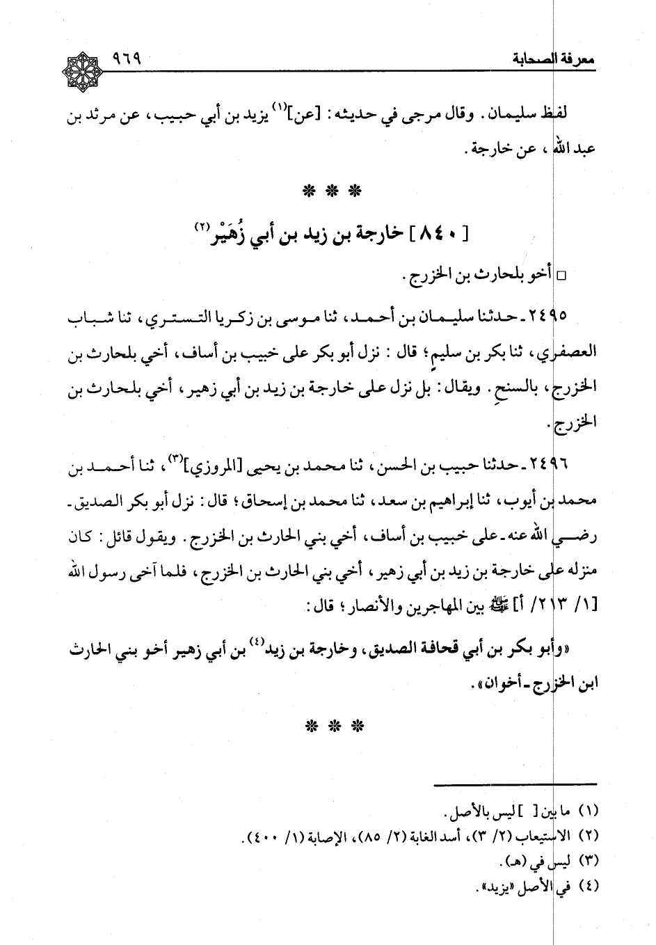 ٢٤٩٦ - حَدَّثَنَا حَبِيبُ بْنُ الْحَسَنِ، ثنا مُحَمَّدُ بْنُ يَحْيَى الْمَرْوَزِيُّ، ثنا أَحْمَدُ بْنُ مُحَمَّدِ بْنِ أَيُّوبَ، ثنا إِبْرَاهِيمُ بْنُ سَعْدٍ، ثنا مُحَمَّدُ بْنُ إِسْحَاقَ، قَالَ: " نَزَلَ أَبُو بَكْرٍ الصِّدِّيقُ رَضِيَ اللهُ عَنْهُ عَلَى خُبَيْبِ بْنِ إِسَافٍ أَخِي بَنِي الْحَارِثِ بْنِ الْخَزْرَجِ وَيَقُولُ قَائِلٌ: كَانَ مَنْزِلُهُ عَلَى خَارِجَةَ بْنِ زَيْدِ بْنِ أَبِي زُهَيْرٍ أَخِي بَنِي الْحَارِثِ بْنِ الْخَزْرَجِ، فَلَمَّا آخَى رَسُولُ اللهِ صَلَّى اللَّهُ عَلَيْهِ وَسَلَّمَ بَيْنَ الْمُهَاجِرِينَ وَالْأَنْصَارِ قَالَ: «وَأَبُو بَكْرِ بْنُ أَبِي قُحَافَةَ الصِّدِّيقُ وَخَارِجَةُ بْنُ زَيْدِ بْنِ أَبِي زُهَيْرٍ أَخُو بَنِي الْحَارِثِ بْنِ الْخَزْرَجِ أَخَوَانِ»