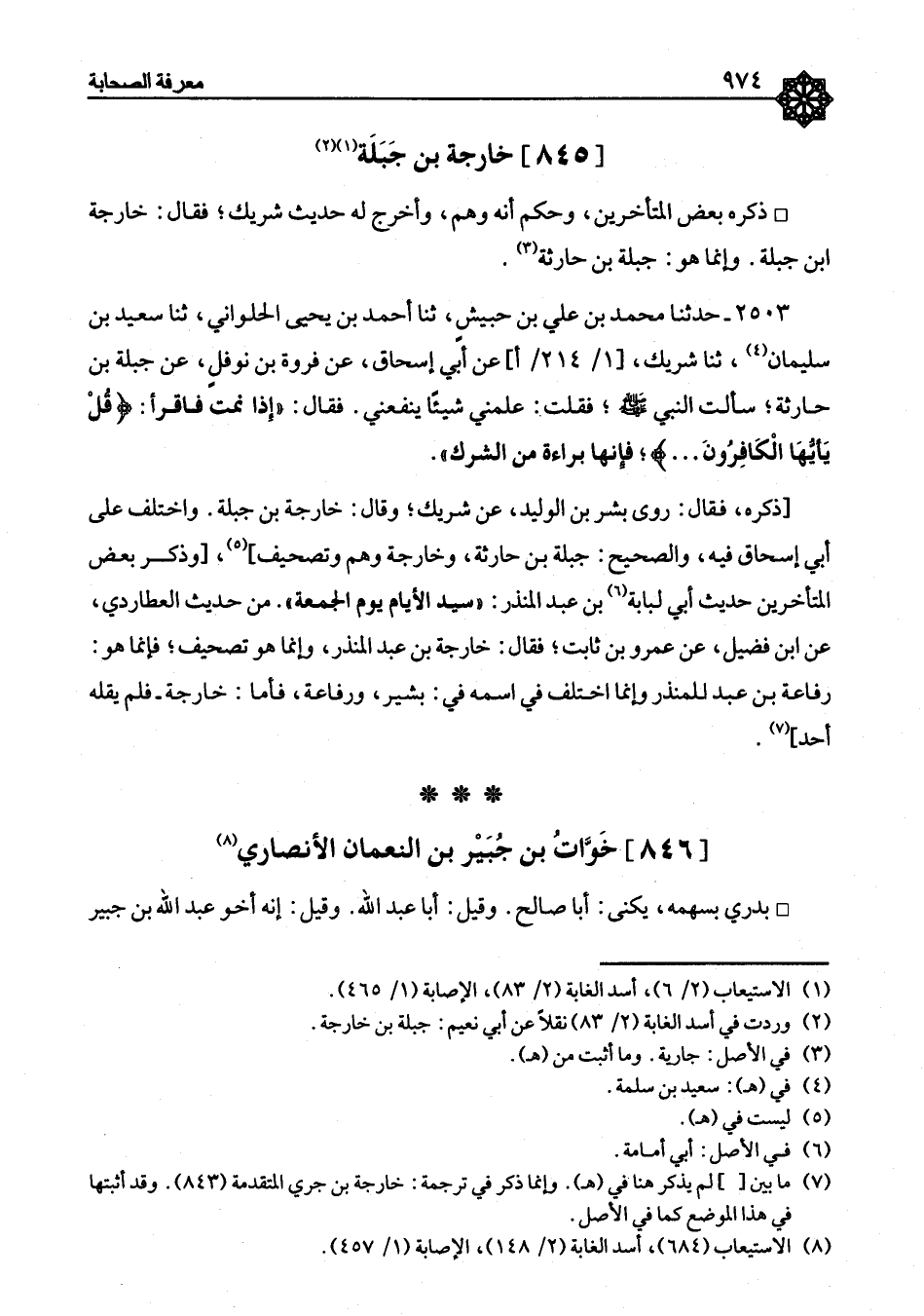 ٢٥٠٣ - حَدَّثَنَا مُحَمَّدُ بْنُ عَلِيِّ بْنِ حُبَيْشٍ، ثنا أَحْمَدُ بْنُ يَحْيَى الْحُلْوَانِيُّ، ثنا سَعِيدُ بْنُ سُلَيْمَانَ، ثنا شَرِيكٌ، عَنْ أَبِي إِسْحَاقَ، عَنْ فَرْوَةَ بْنِ نَوْفَلٍ، عَنْ جَبَلَةَ بْنِ حَارِثَةَ، سَأَلْتُ النَّبِيَّ صَلَّى اللَّهُ عَلَيْهِ وَسَلَّمَ، فَقُلْتُ: عَلِّمْنِي شَيْئًا يَنْفَعُنِي فَقَالَ: " إِذَا نِمْتَ فَاقْرَأْ {قُلْ يَا أَيُّهَا الْكَافِرُونَ} [الكافرون: ١] فَإِنَّهَا بَرَاءَةٌ مِنَ الشِّرْكِ " ذَكَرَهُ، فَقَالَ: رَوَى بِشْرُ بْنُ الْوَلِيدِ، عَنْ شَرِيكٍ، وَقَالَ خَارِجَةُ بْنُ جَبَلَةَ، وَاخْتُلِفَ عَلَى أَبِي إِسْحَاقَ فِيهِ، وَالصَّحِيحُ: جَبَلَةُ بْنُ حَارِثَةَ، وَخَارِجَةُ وَهْمٌ وَتَصْحِيفٌ، وَذَكَرَ بَعْضُ الْمُتَأَخِّرِينَ حَدِيثَ أَبِي لُبَابَةَ بْنِ عَبْدِ الْمُنْذِرِ: «سَيِّدُ الْأَيَّامِ يَوْمُ الْجُمُعَةِ» مِنْ حَدِيثِ الْعُطَارِدِيِّ، عَنِ ابْنِ فُضَيْلٍ، عَنْ عَمْرِو بْنِ ثَابِتٍ، فَقَالَ: خَارِجَةُ بْنُ عَبْدِ الْمُنْذِرِ، وَإِنَّمَا هُوَ تَصْحِيفٌ، فَإِنَّمَا هُوَ: رِفَاعَةُ بْنُ عَبْدِ الْمُنْذِرِ وَإِنَّمَا اخْتُلِفَ فِي اسْمِهِ فِي بَشِيرٍ، وَرِفَاعَةَ، فَأَمَّا خَارِجَةُ فَلَمْ يَقُلْهُ أَحَدٌ